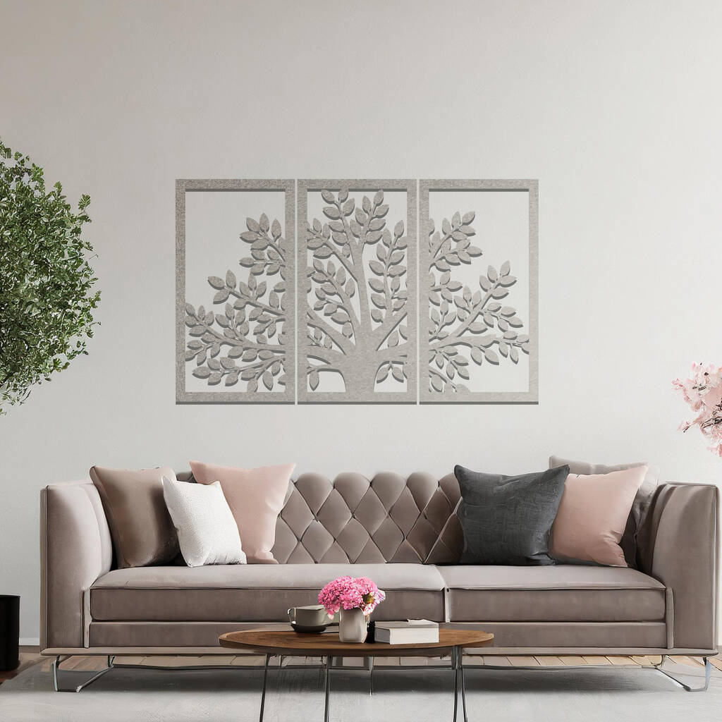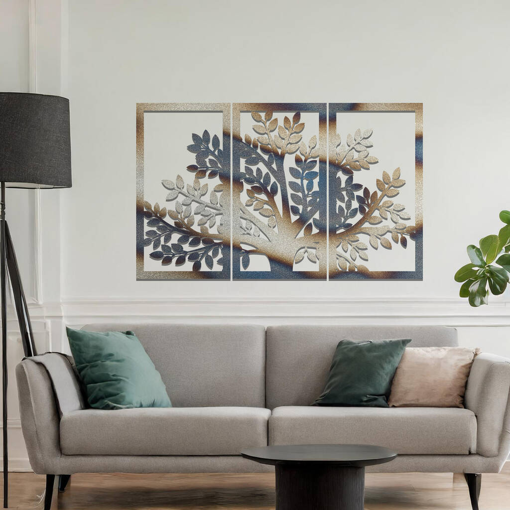 Modern Metal Tree Triptych Wall Art Panel Set For Living Room Or Hallway Decor
