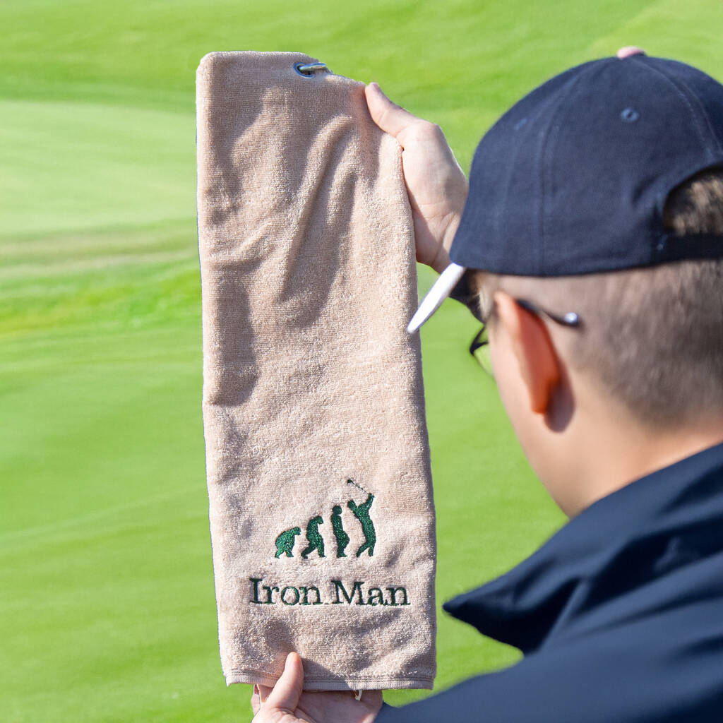 Customised golf towel folds neatly, attaches to golf bag and is perfect for golfers who want to keep clubs and hands clean and dry. This golf towel is 100% cotton velour, 590gsm with a carabiner clip desinged to attach to a golf bag for your convienance. Embroidered at our Sussex workshop by our small team of skilled craftspeople, your towel can be personalised for you with name or initials underneath the 'Golf Evolution' logo.