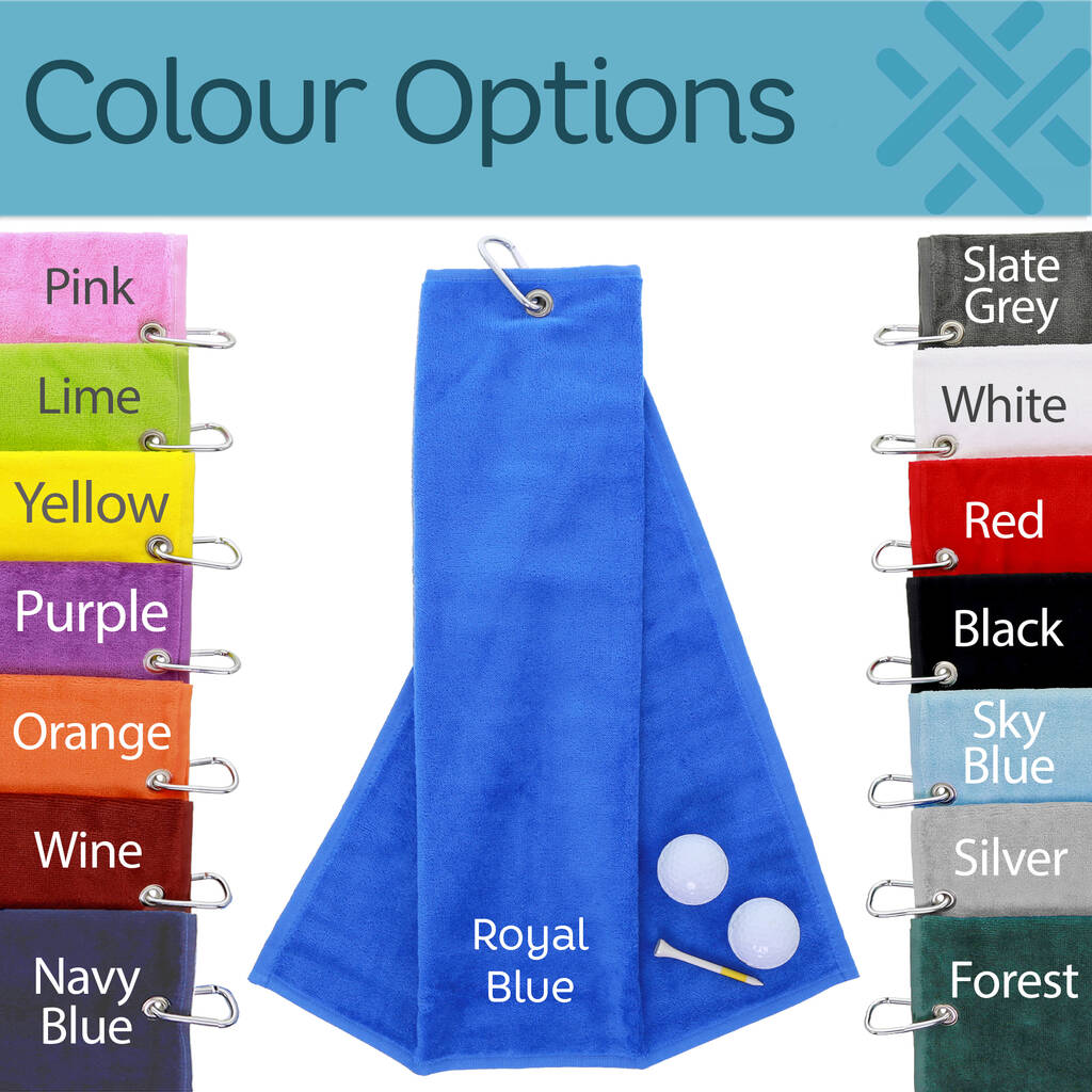 Customised golf towel folds neatly, attaches to golf bag and is perfect for golfers who want to keep clubs and hands clean and dry. This golf towel is 100% cotton velour, 590gsm with a carabiner clip desinged to attach to a golf bag for your convienance. Embroidered at our Sussex workshop by our small team of skilled craftspeople, your towel can be personalised for you with name or initials underneath the 'Golf Evolution' logo.