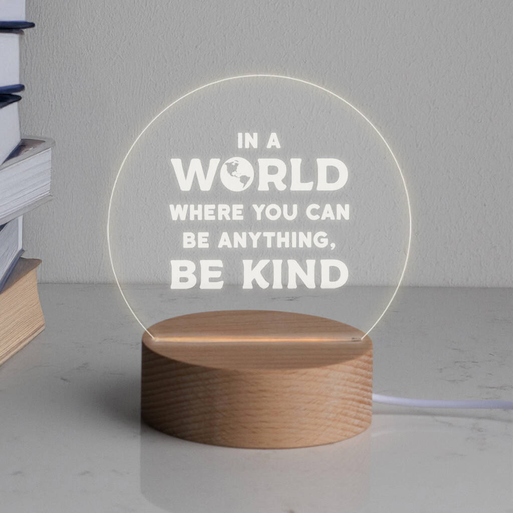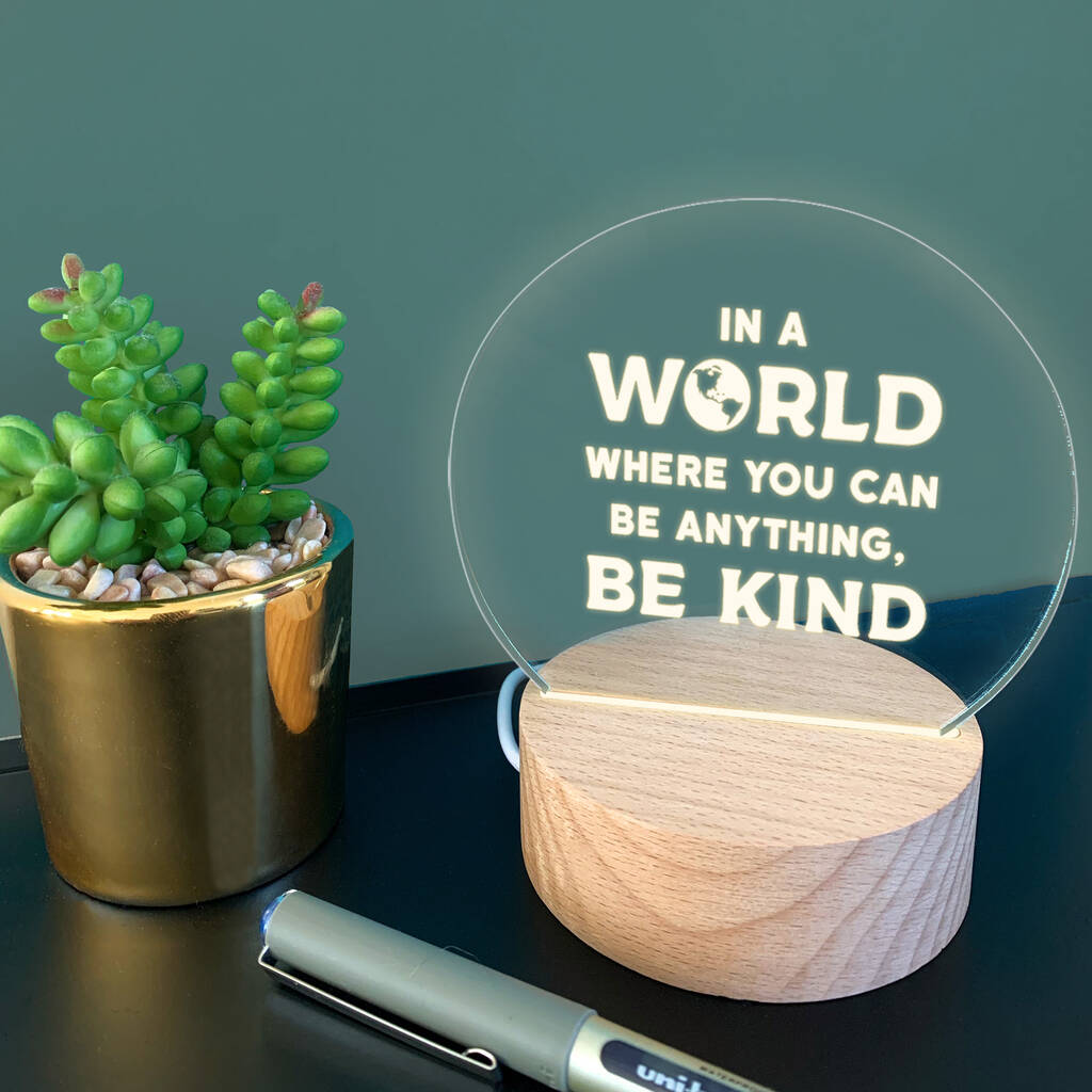 The acrylic topper will be beautifully engraved with the positive quote 'In A World Where You Can Be Anything, Be Kind' in a lovely font that will compliment any home office decor. The mini desk lamp comes in two parts making it the perfect positive letterbox gift for your friend to construct and display on her desk or bedside table.