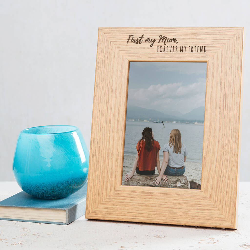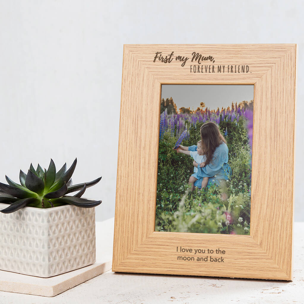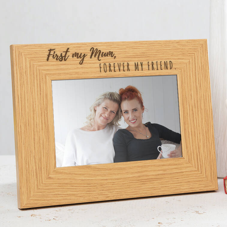 Whether you are a son or daughter we can all agree mums are magical! Celebrate how much she means to you with a sweet personalised gift for mum. This sentimental wooden photo frame with an oak veneer exterior is engraved with the sweet but fitting words 'First my Mum, Forever my Friend', making the picture frame an stylish addition to her home.