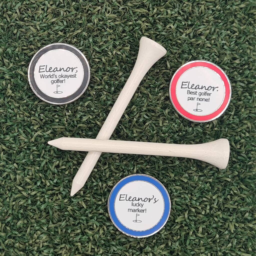 Each marker has a different quote, "[Name's] luck marker!", "[Name]; World's okayest golfer! & "[Name]; Best golfer par none!" You just need to let us know the name to be printed on the markers