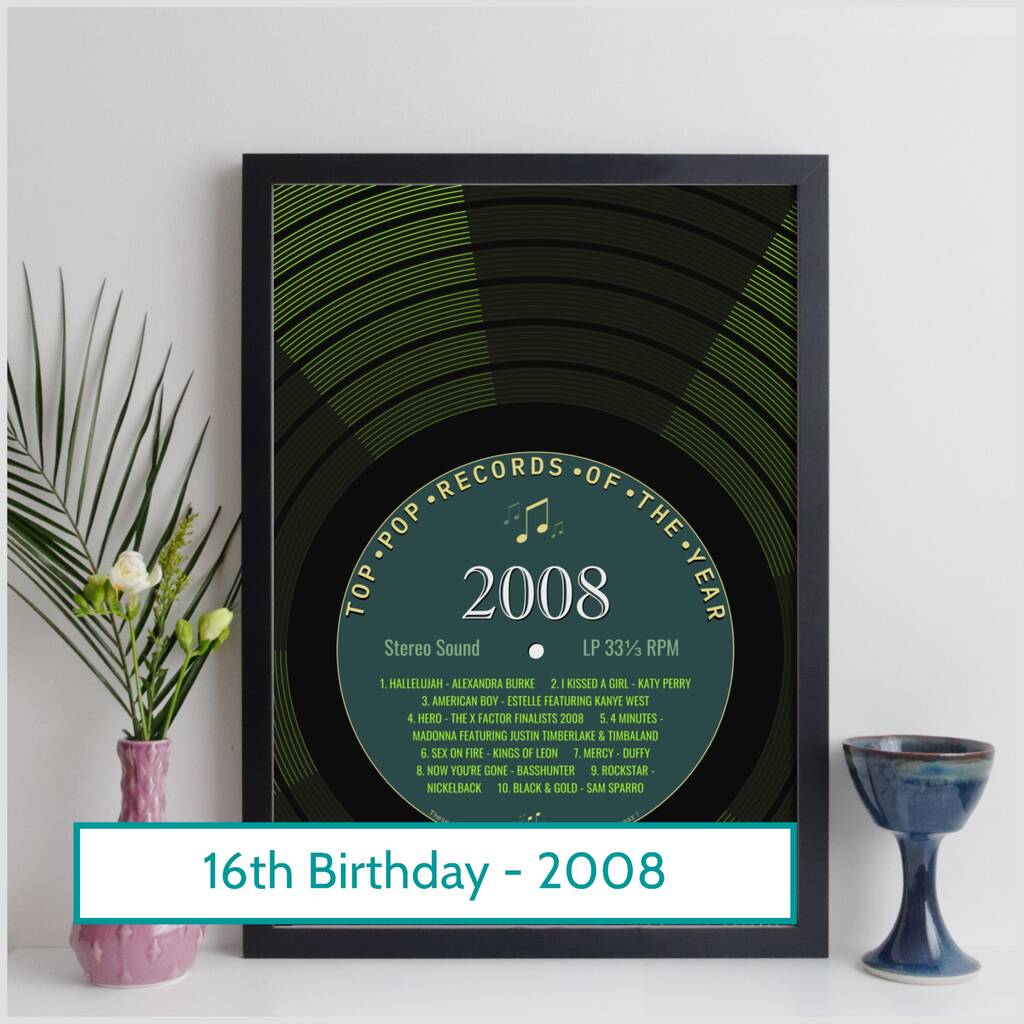 The print shows a record label listing ten of the most popular songs of 2008 - it's a little bit of personal music history for anyone born back in 2008. A thoughtful personalised 18th birthday print, great for a son or daughter who is a fan of popular music or vinyl.