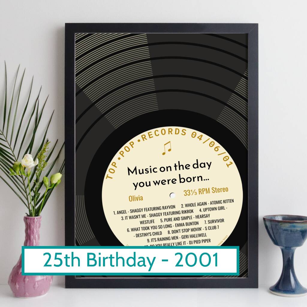 A special personalised 25th birthday gift for a music fan turning 25 this year. The print shows a close up of a vinyl LP record label with ten of the most popular records on the day they were born, in 2001. It's a brilliant personalised 25th birthday print for him or her, especially if they love music and were born in 2001.