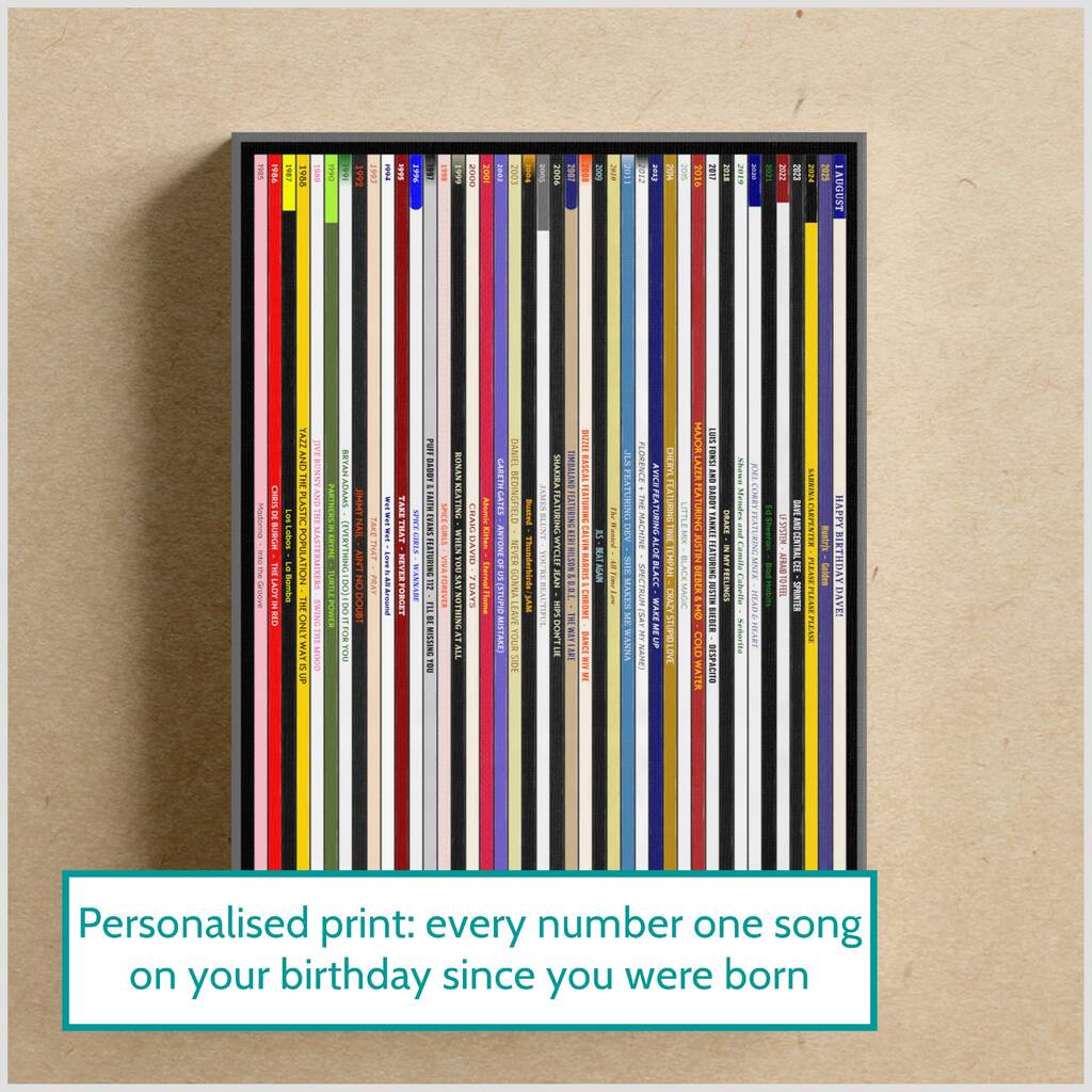 This personalised 40th birthday music print pictures a record collection showing the number one song on every birthday, from 1985 to the latest available birthday number one on the date you order. If the birthday is 29th April, for example, every number one song on every 29th April since 1985 appears on the print, in year order. A brilliant conversation starter, this print shows a whole lifetime of number one hit songs for anyone celebrating their 40th birthday! A great Christmas gift too.