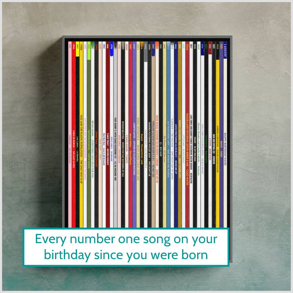 Personalised 40th birthday print picturing a music collection of every number one on the same date each year since 1985. A unique 40th birthday gift