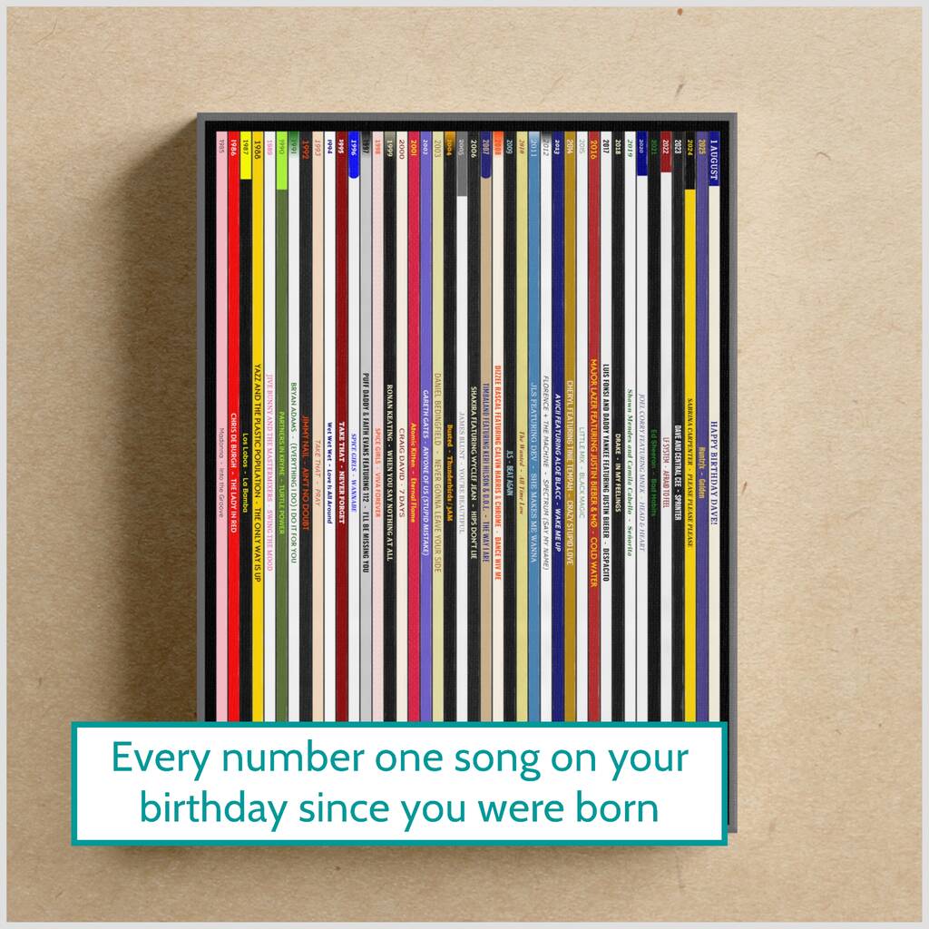 This personalised 40th birthday music print pictures a record collection showing the number one song on every birthday, from 1985 to the latest available birthday number one on the date you order. If the birthday is 29th April, for example, every number one song on every 29th April since 1985 appears on the print, in year order. A brilliant conversation starter, this print shows a whole lifetime of number one hit songs for anyone celebrating their 40th birthday! A great Christmas gift too.