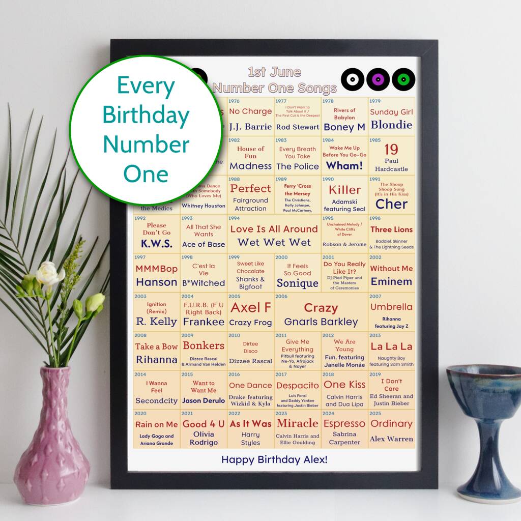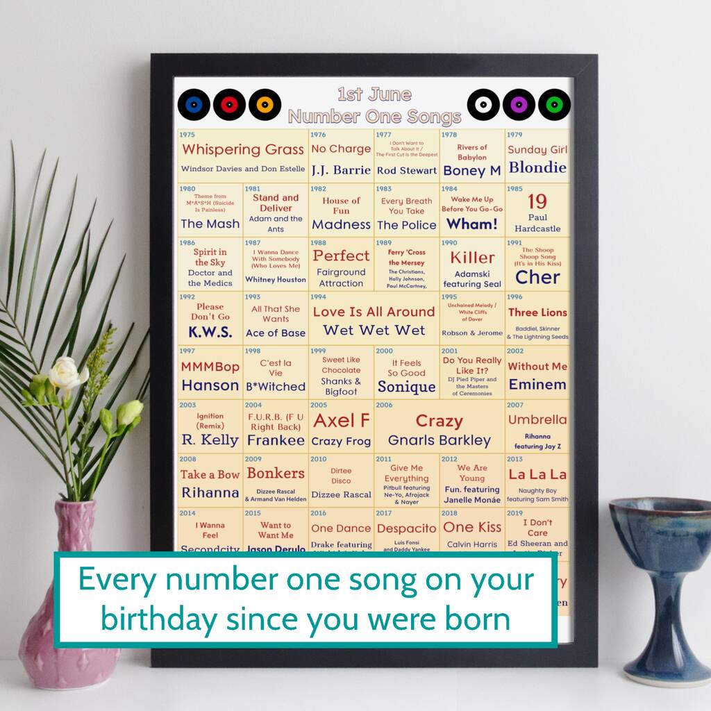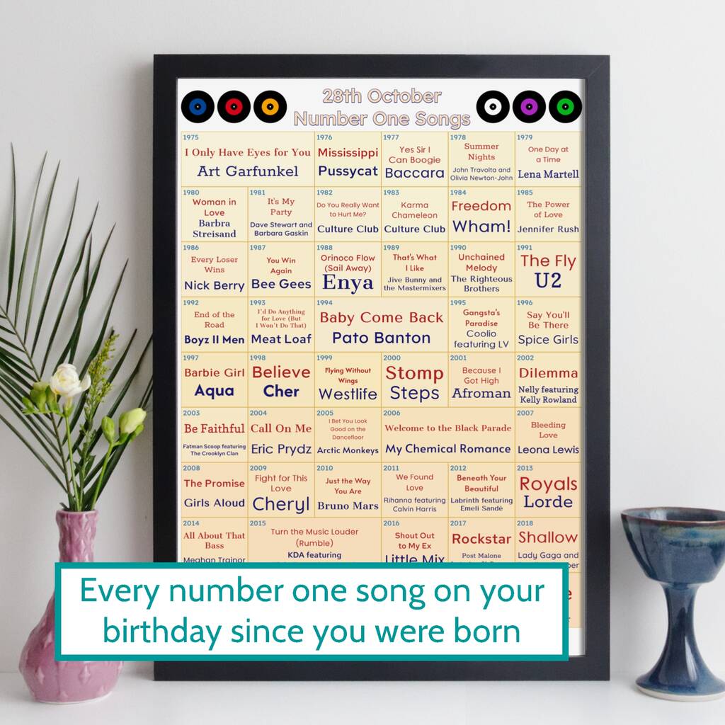 This unique personalised 50th birthday print shows a the number one song (title and artist) on each birthday for each year, from 1975 to the latest available number one - a whole lifetime of number one songs! For a birth date of 19th August, the print shows the number one song on every 19th August for every year since 1975.