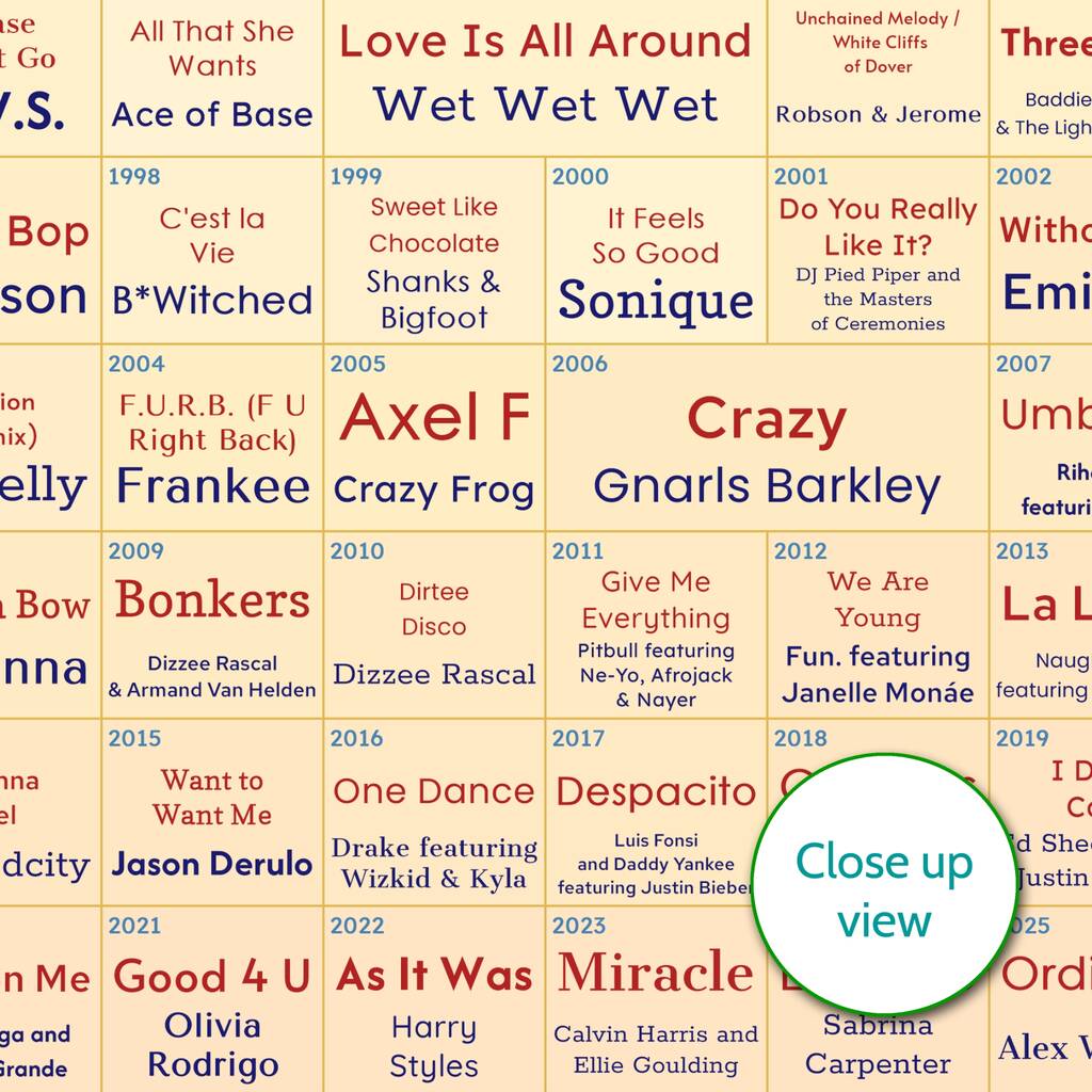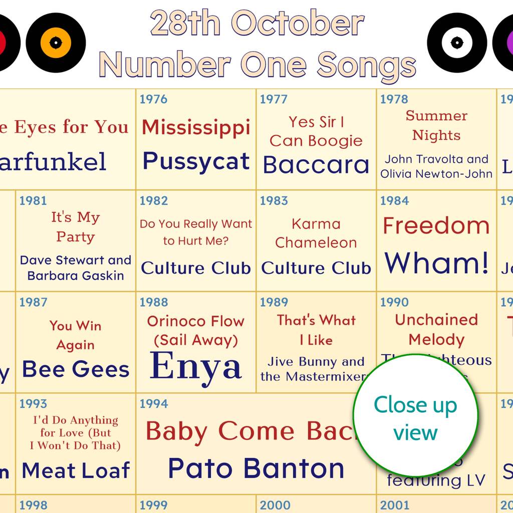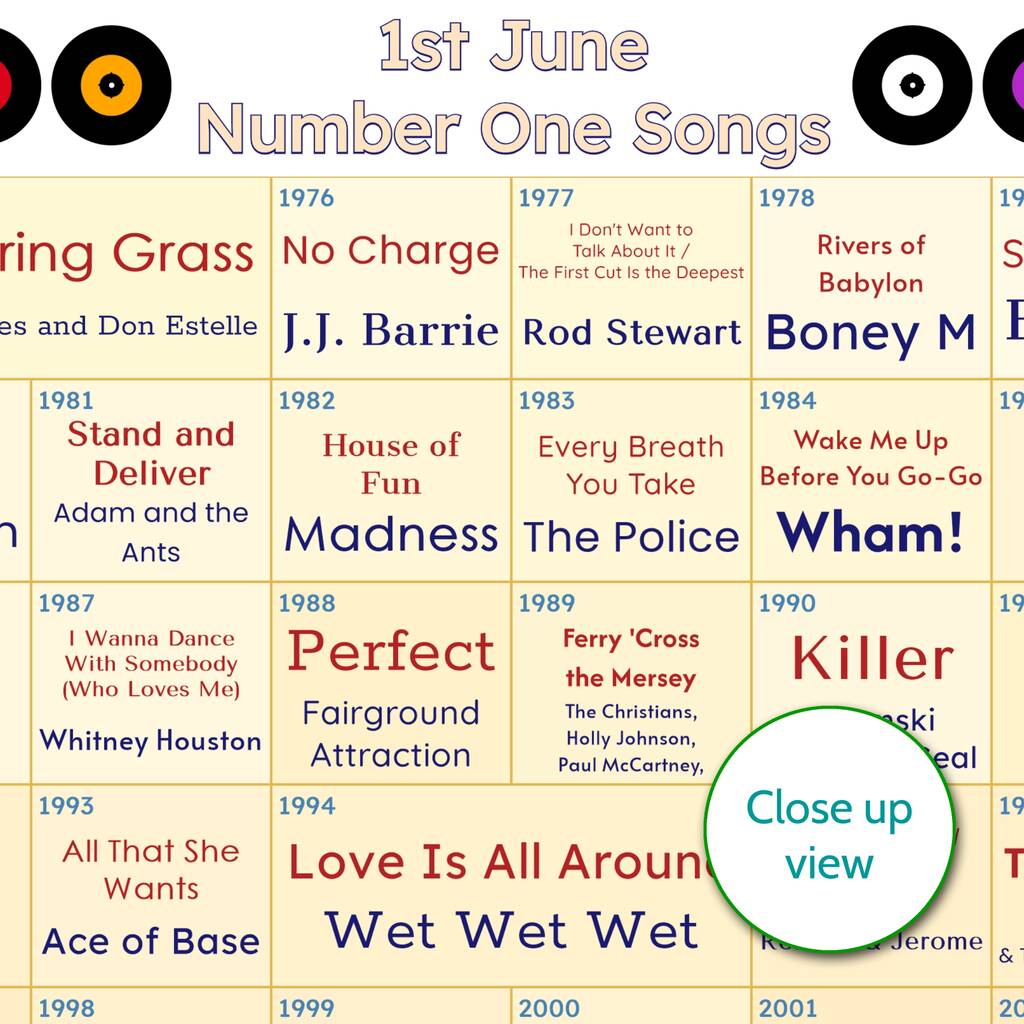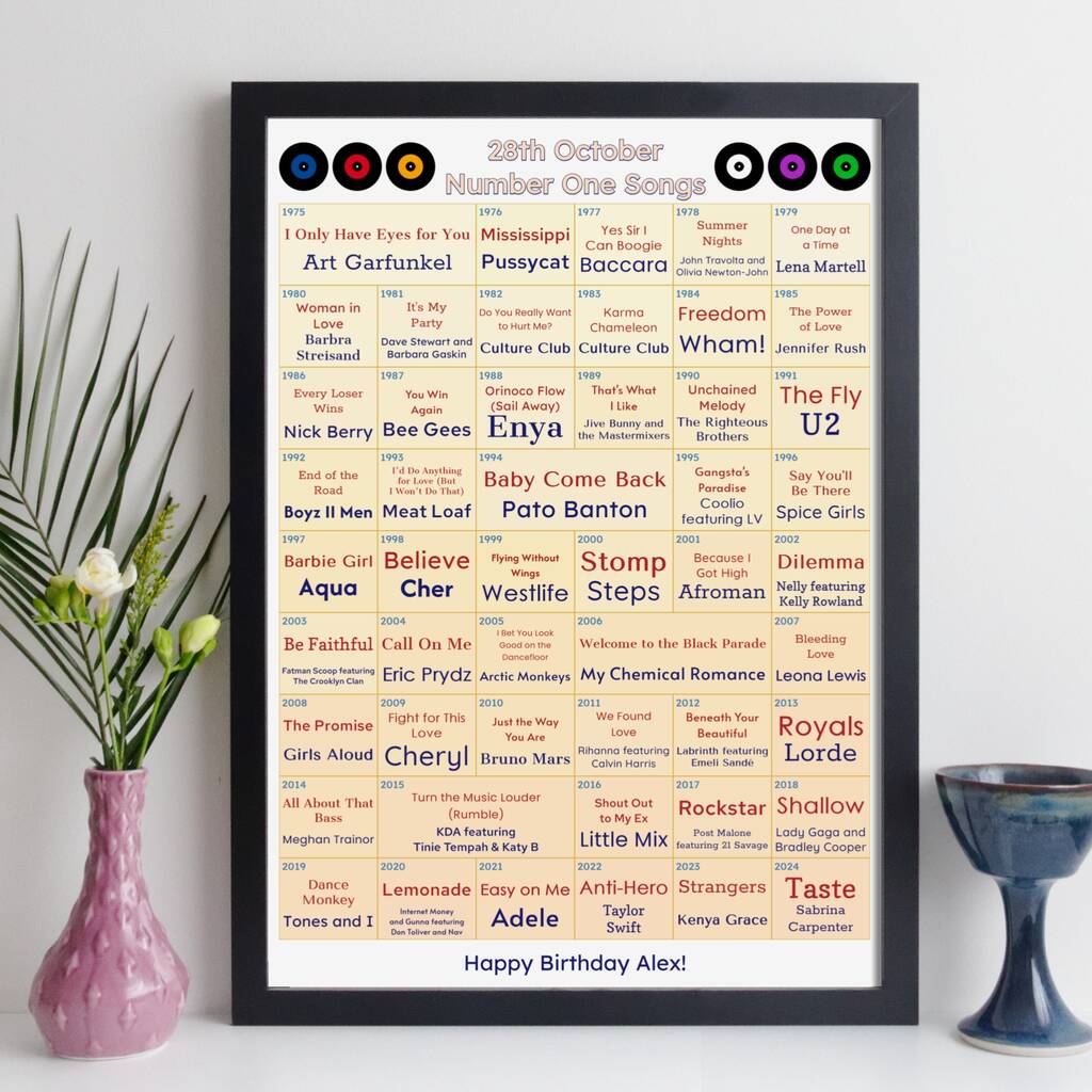This unique personalised 50th birthday print shows a the number one song (title and artist) on each birthday for each year, from 1975 to the latest available number one - a whole lifetime of number one songs! For a birth date of 19th August, the print shows the number one song on every 19th August for every year since 1975.