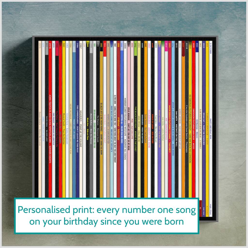 A personalised 50th birthday print that pictures a music record collection of the number one song on every birthday, from 1975 to the latest available birthday number one. If the recipient's birthday is 20th June, the print shows the number one song on every 20th June since 1975: a lifetime of number one songs for anyone celebrating their 50th birthday! A great gift for mum or dad celebrating their milestone half century. A great Christmas gift too!