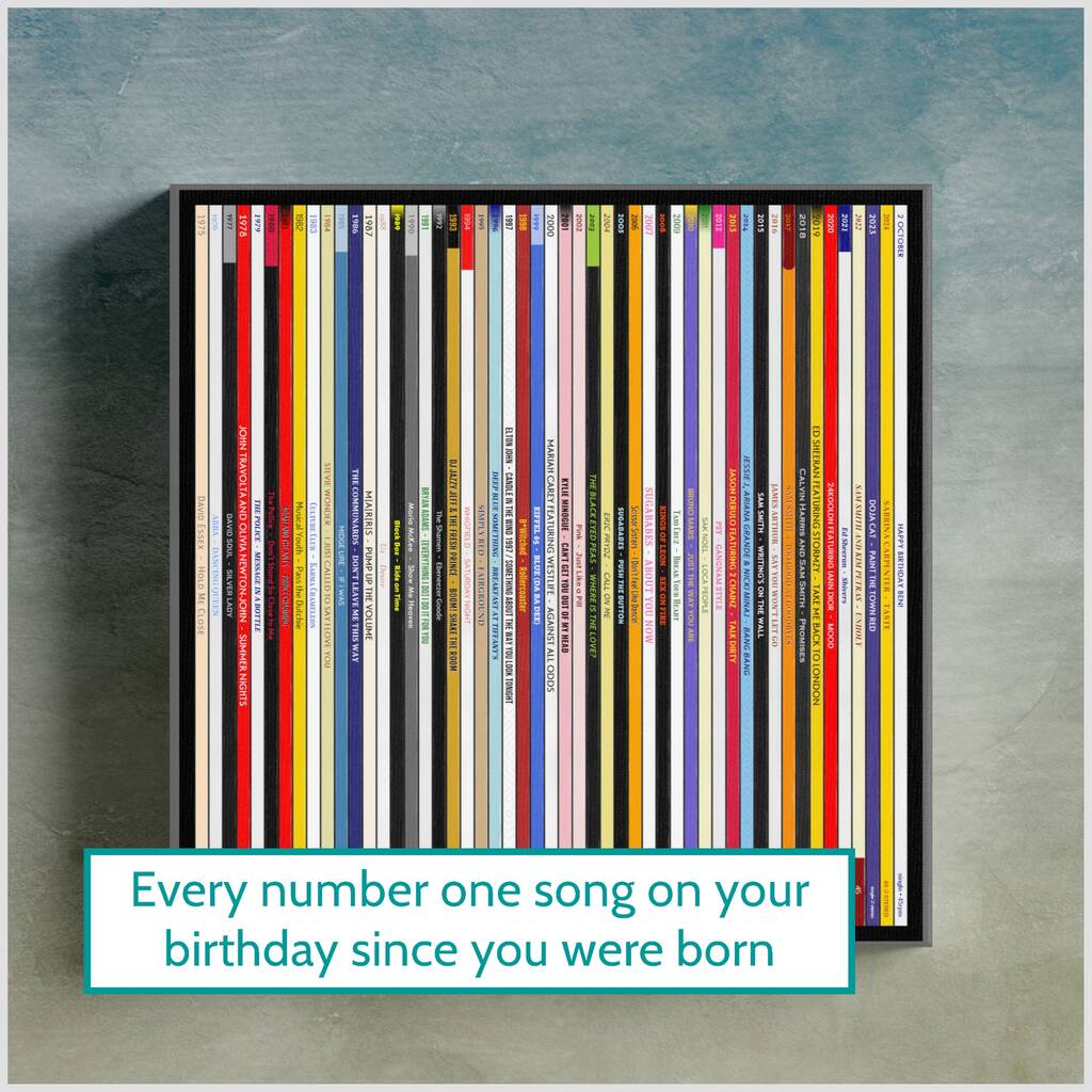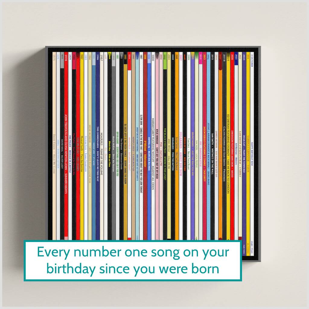 A personalised 50th birthday print that pictures a music record collection of the number one song on every birthday, from 1975 to the latest available birthday number one. If the recipient's birthday is 20th June, the print shows the number one song on every 20th June since 1975: a lifetime of number one songs for anyone celebrating their 50th birthday! A great gift for mum or dad celebrating their milestone half century. A great Christmas gift too!