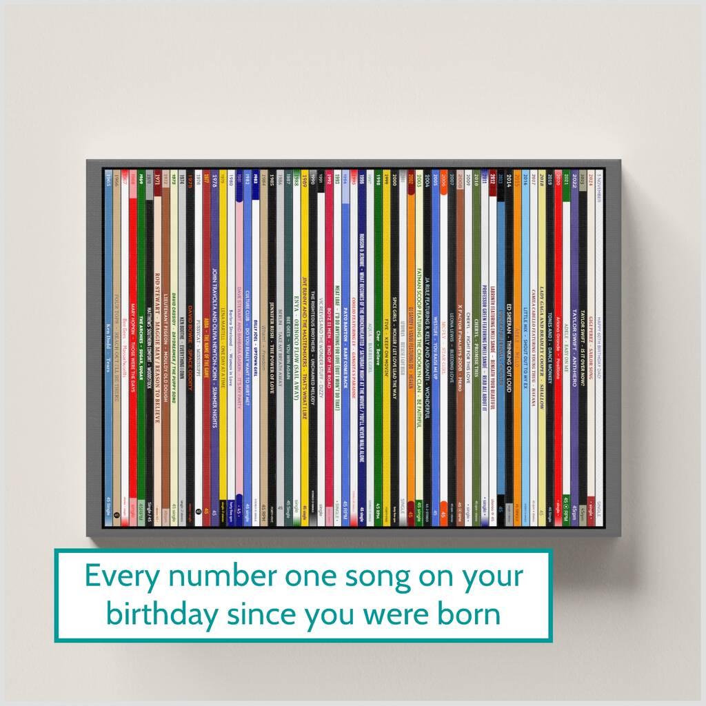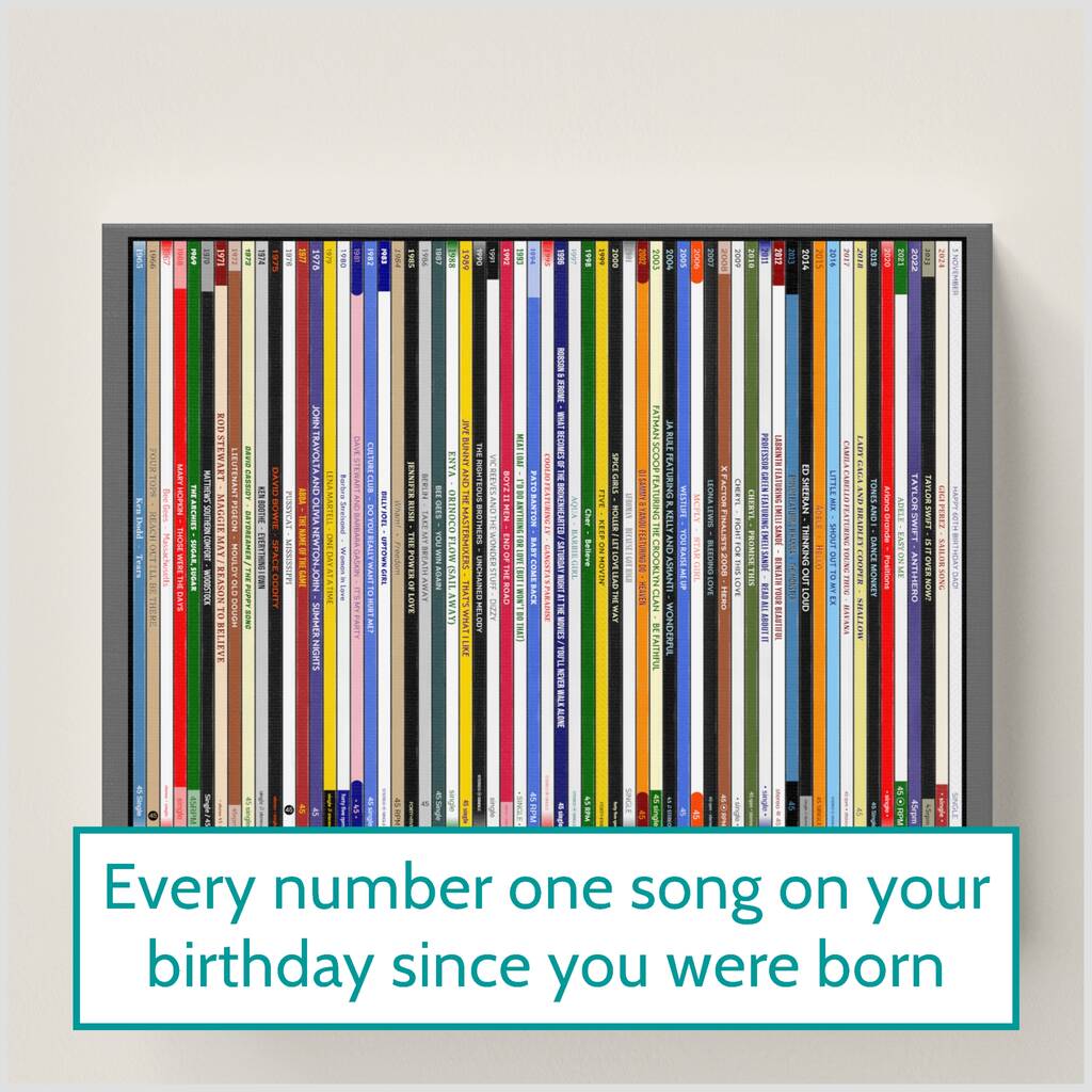 This personalised 60th birthday music print pictures a record collection of number one songs for every birthday, from 1965, their birth year, to the latest available birthday number one. If the recipient's birthday is 18th February, the print shows the number one song on every 18th February since 1965 - a whole lifetime of number one songs for anyone celebrating thier 60th birthday! A nostalgic conversation starter, especially for music lovers, and a great 60th birthday gift for him or her. A great Christmas gift too!