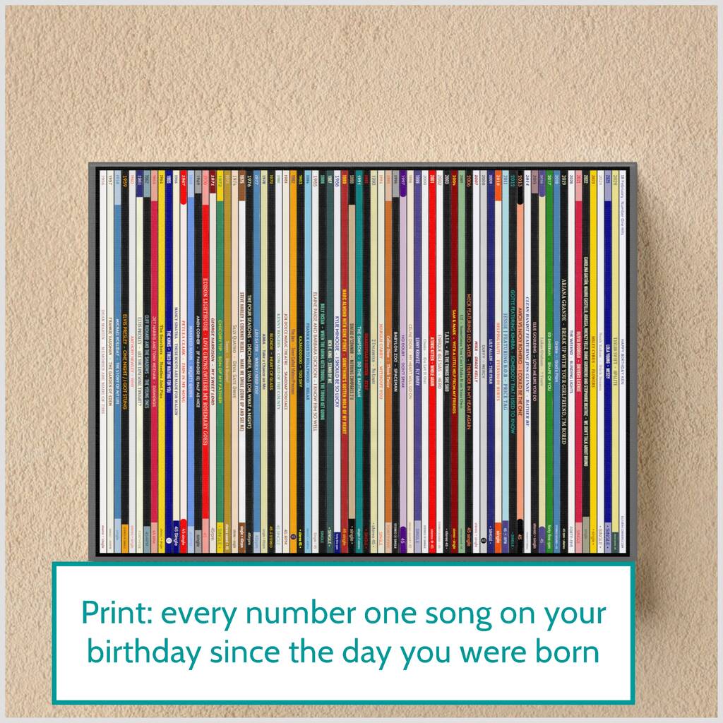This personalised 70th birthday music print pictures a record collection of number one songs: every number one on every birthday since 1956, right up to the latest available birthday number one. If the recipient's birthday is 26th April, this print shows the number one song on every 26th April since their birth year in 1956: a lifetime of number one songs for anyone celebrating thier 70th birthday! A brilliant conversation starter, an ideal gift for music lovers, and a unique 70th birthday gift for him or her.