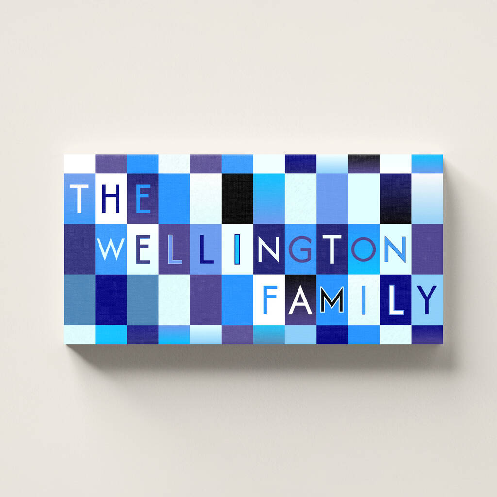 Personalised family name sign print that's bold and colourful. Brilliant personalised family surname gift for him or her, available unframed or as a canvas print