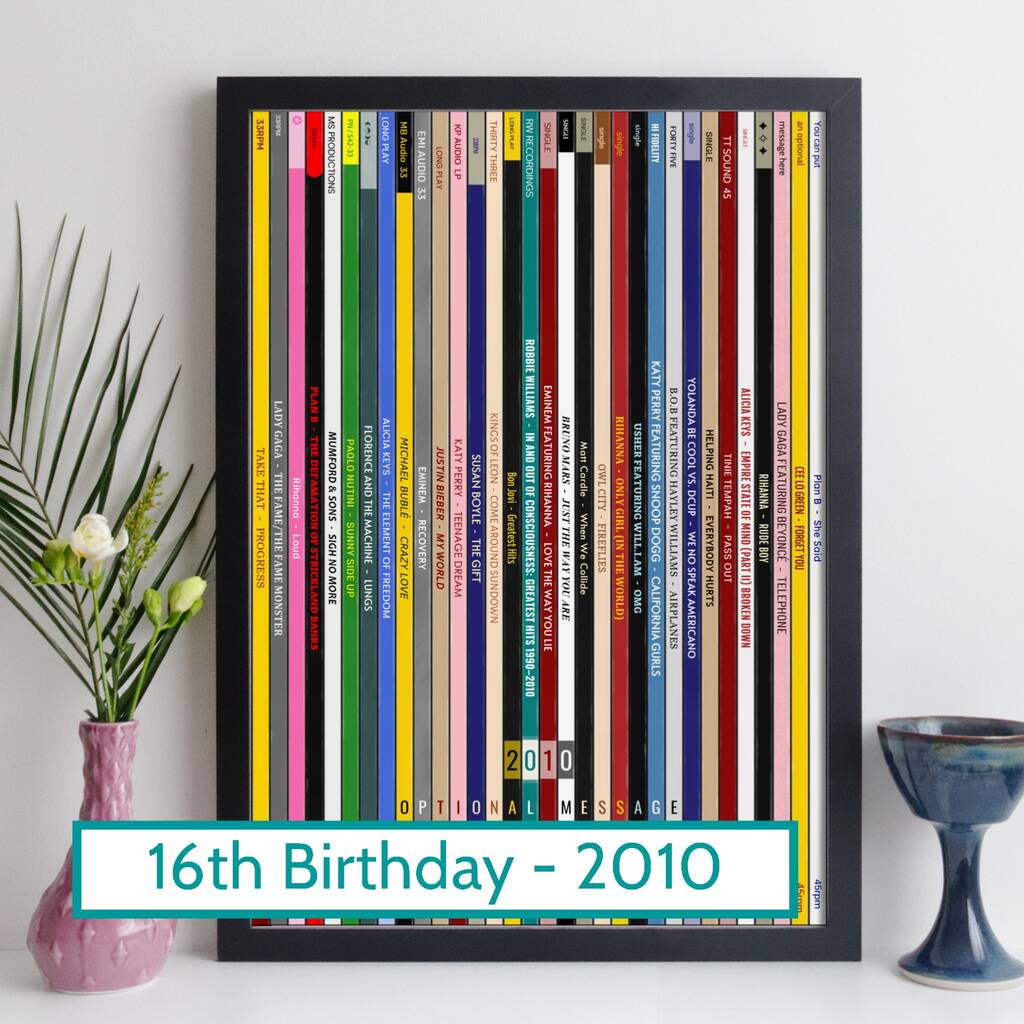 The print pictures a record collection stuffed with popular albums and singles that were high in the charts in 2010 - it's a fantastic memory-jogger and conversation-starter, a unique personalised 16th birthday gift for a music fan.