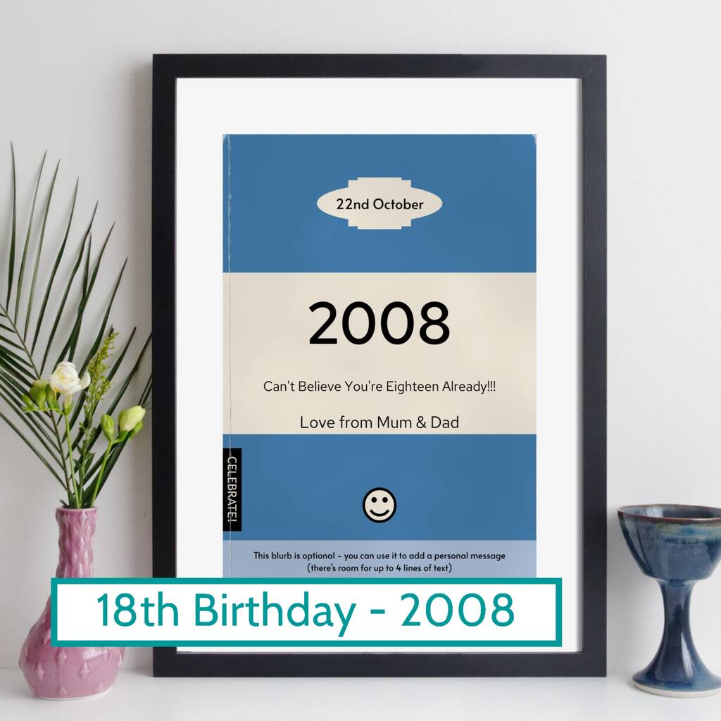 A personalised 18th birthday 2008 print showing a custom classic paperback book cover, personalised with your own text. A great daughter or son gift!