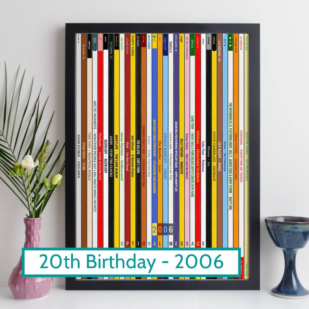 A personalised music themed print that's an ideal 20th birthday gift, especially for a music lover. The print celebrates popular music from the year 2006 - it pictures a record collection of popular albums and singles that were big-sellers in 2006.
