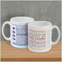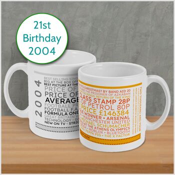A personalised 21st birthday mug showing lots of fascinating facts about 2004. For anyone turning twenty one, this mug celebrates the year they were born. Add a personalised message to make your mug into a really thoughtful gift. It's a brilliant gift for him or for her.