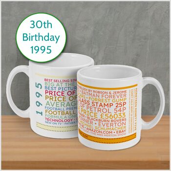 A personalised 30th birthday mug that's covered in fascinating facts about 1995. For anyone turning thirty, this mug celebrates the year they were born. Add a personalised message to make your mug into a really personal milestone 30th birthday gift that's equally appropriate for him or her.