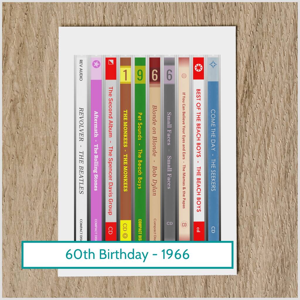 The year, 1966, appears along the top of the middle four CDs shown on this personalised 60th birthday card. It's a unique card for a music fan born in 1966 - perfect for mum, dad, granny or grandad! It might stir a few memories!