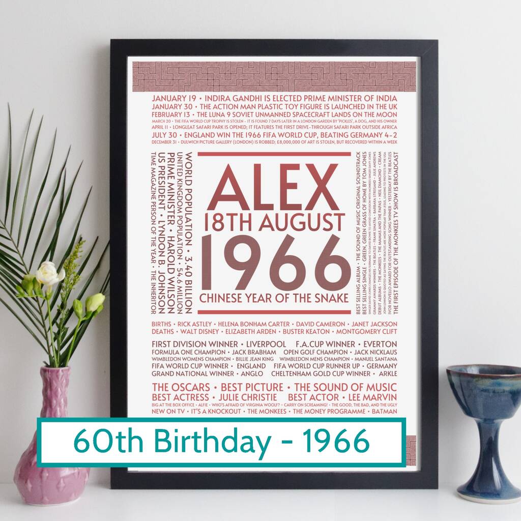 Fascinating personalised 60th birthday print packed with trivia and facts from 1966. Brilliant personalised 60th birthday gift for mum, dad, granny or grandad