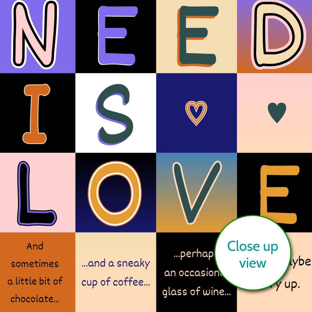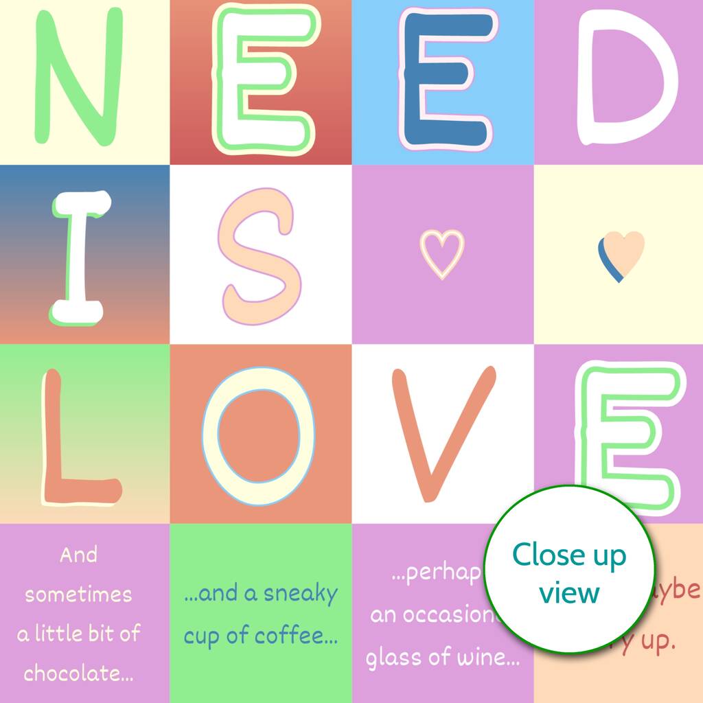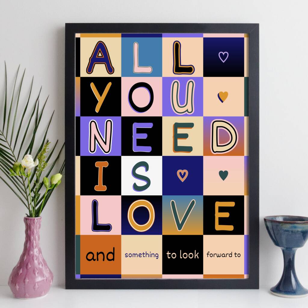 Colourful personalised ALL YOU NEED IS LOVE print or card with a twist: personalise it by extending the sentance, All you need is love...