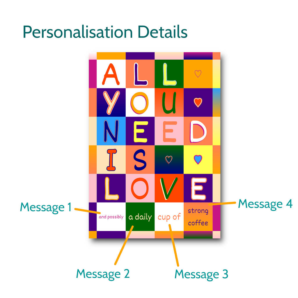 PERSONALISE YOUR PRINT: Personalise the print with 4 messages printed in the boxes below 'ALL YOU NEED IS LOVE'.