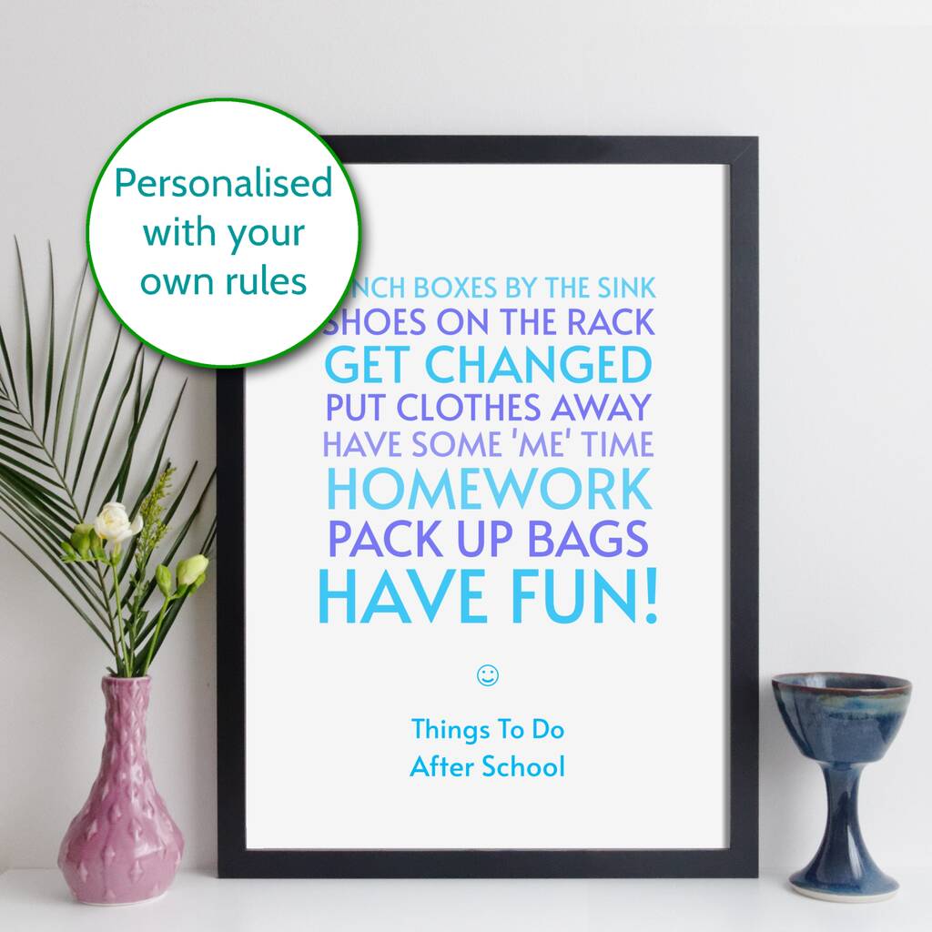 A colourful, fun personalised family rules print with your own list of rules and your own title. A gentle reminder list for children or family!