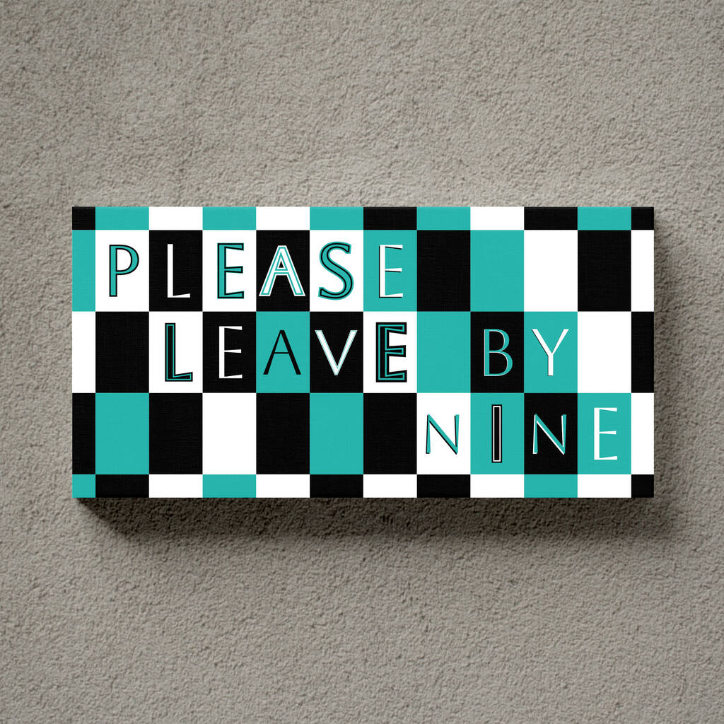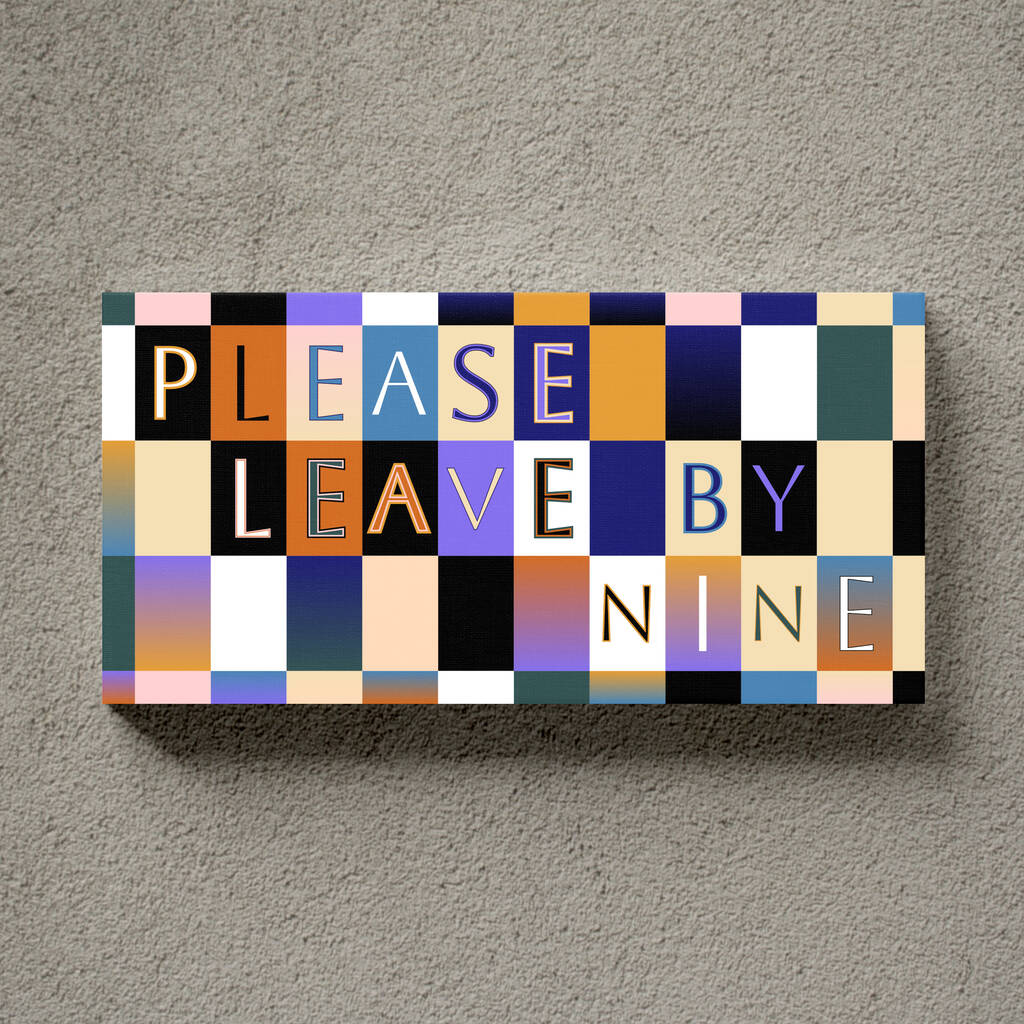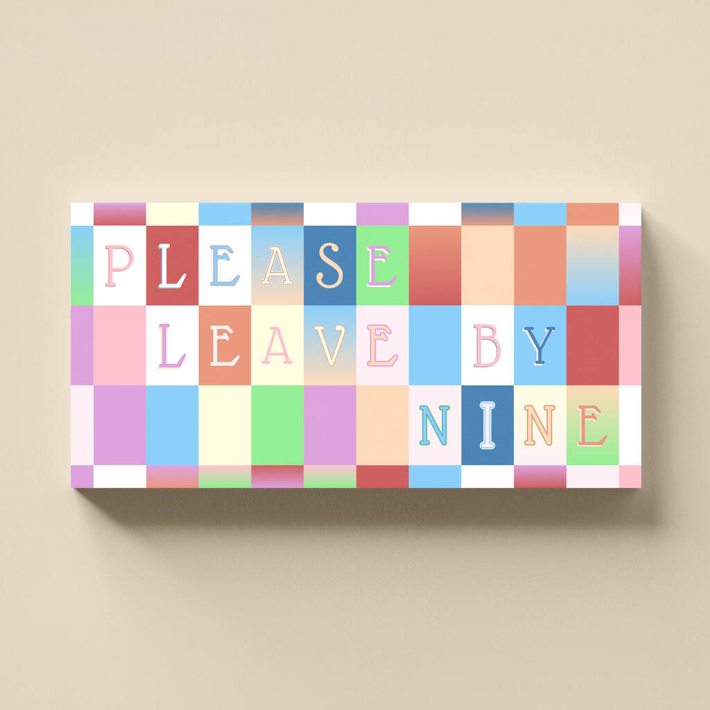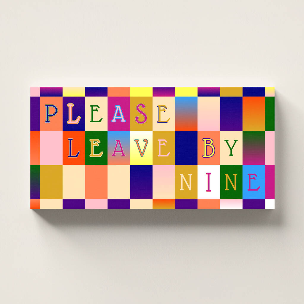A colourful PLEASE LEAVE BY NINE print in a design that mixes colour, style and a choice of fonts. A great way to add colour to any home. A great home gift for him or her - a perfect Christmas gift.