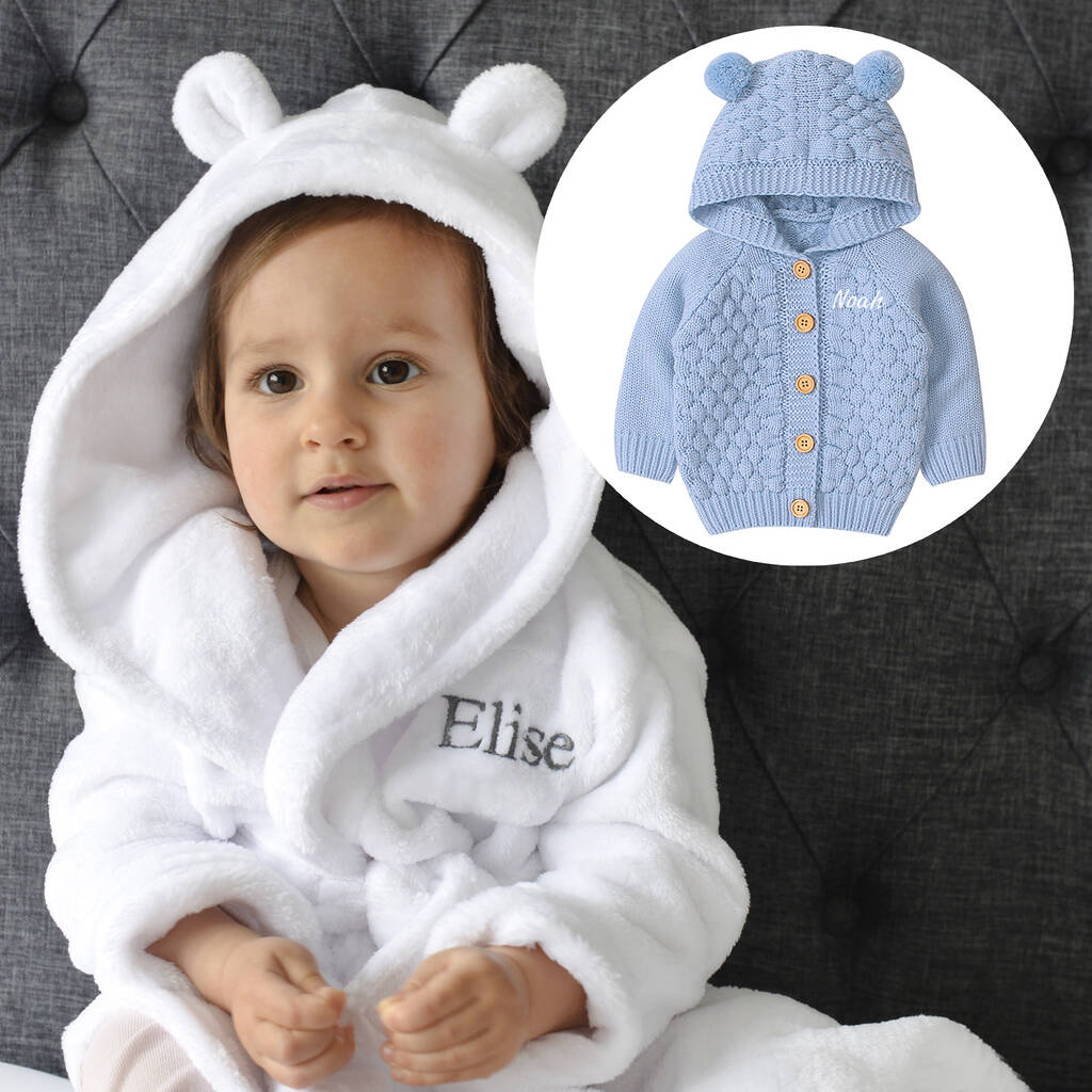 A beautiful soft and cuddly white baby dressing gown and a blue knitted bobble hooded cardigan, both personalised with baby's name.