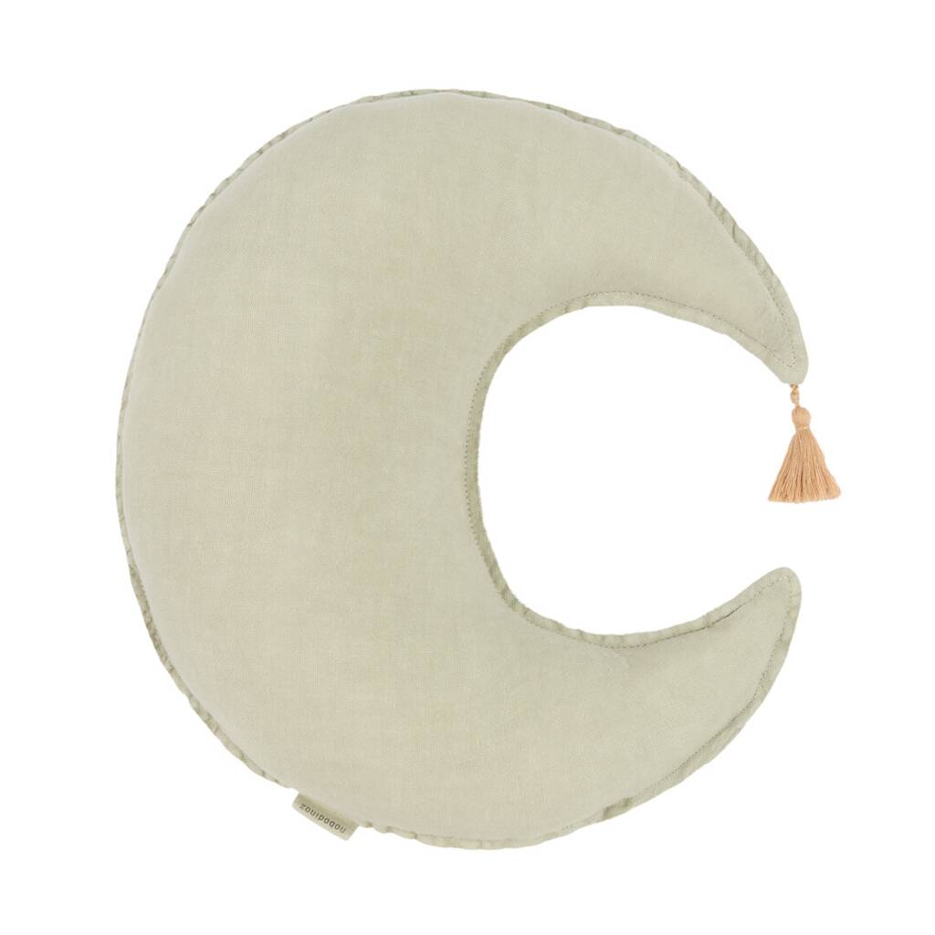Soft French linen moon cushion with a delicate tassel, adding charm and gentle magic while supporting sustainable, locally crafted production from France to Barcelona.The Nobodinoz Moon cushion in French linen from the L1N0 collection adds a magical, decorative touch to any children’s bedroom, complete with a delicate tassel and a wide choice of colours. The L1N0 collection blends tradition, innovation, design, and sustainability, offering meaningful home accessories crafted with care. Made from environmentally friendly French linen that requires minimal irrigation, the material is grown and spun in France, then woven, finished, and tailored in Barcelona. The long, unblended fibres create a strong, supple fabric that feels soft and gentle on babies’ skin. A short local production chain further reduces environmental impact.