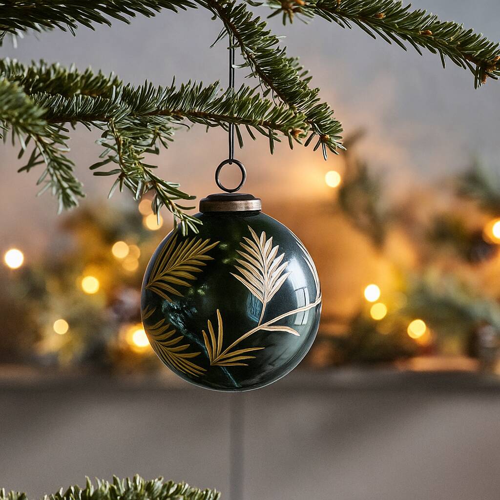 Set Of Four Green And Gold Leaf Baubles