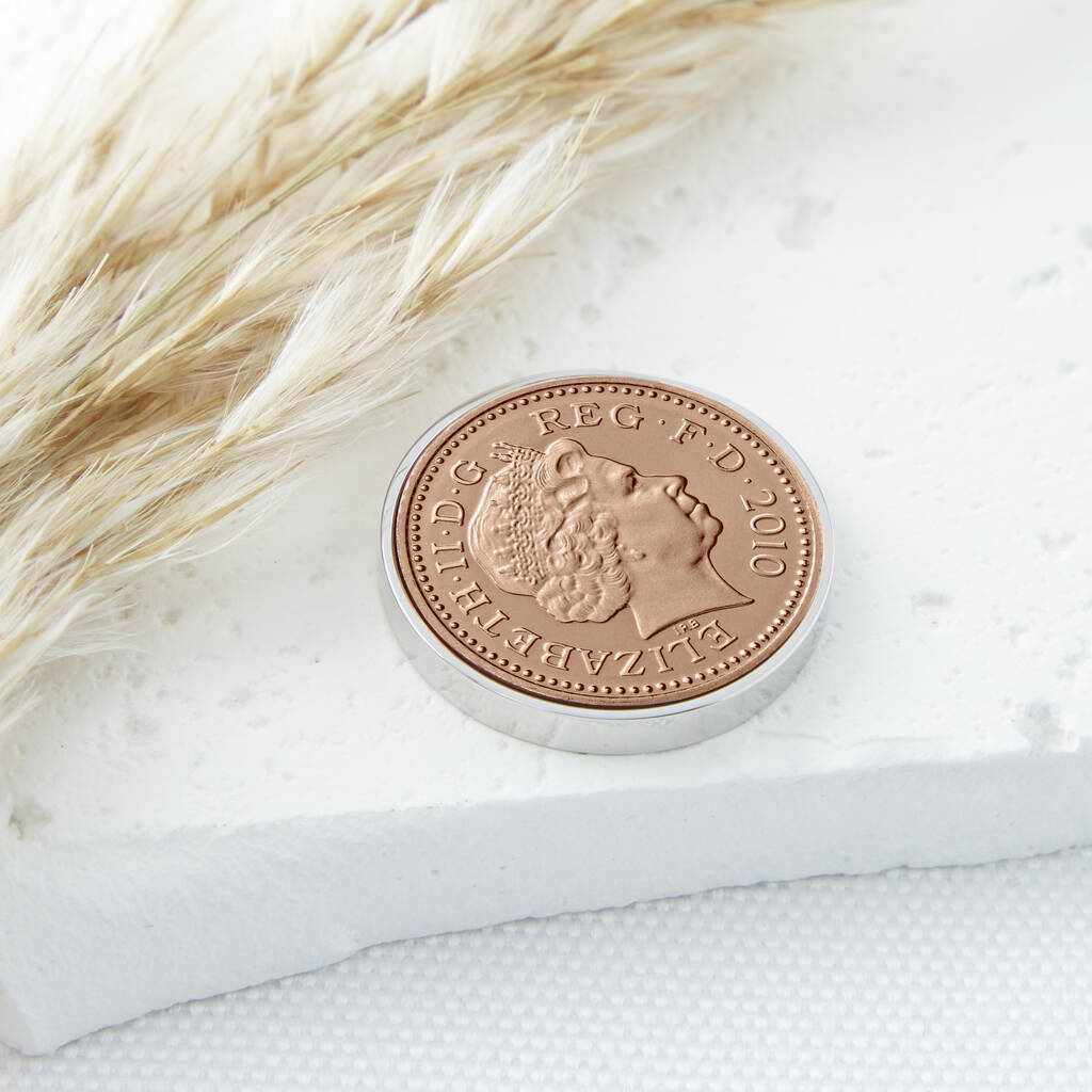 Designed and handcrafted by Ellie Ellie in Sussex (UK), our personalised penny coin keepsake tokens features an original 2010 penny.