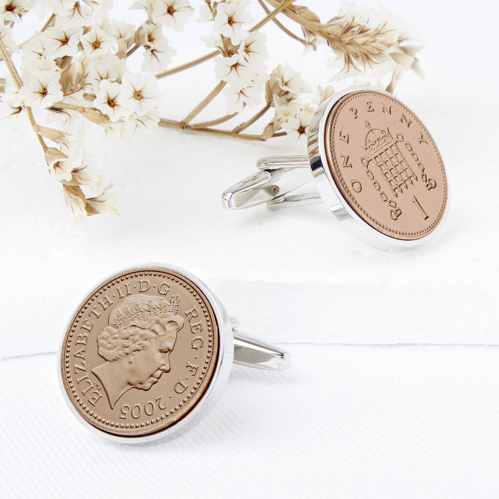 An iconic gift to celebrate the big 21st birthday, celebrate in style with our unique pair of penny cufflinks featuring a 2004 or 2005 penny coin minted in their year of birth.