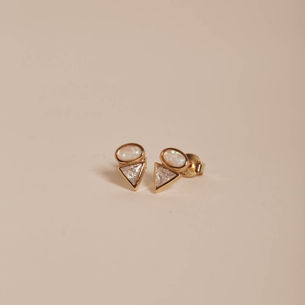 These beautifully crafted opal and diamante triangle studs bring together soft opal glow and subtle sparkle for a timeless everyday jewellery piece.