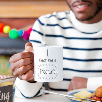 Designed and printed by Ellie Ellie in Sussex (UK), our ceramic mug features a trendy black design with an arrow pointing upwards and reading 'Got a Masters' with your choice of name on a white ceramic mug. Both stylish and functional, our mug is the perfect tea or coffee essential to fuel long hard study days. A great graduation gift for the smarty pants in your life, they can let the world know just how smart they are without ever having to utter a word.