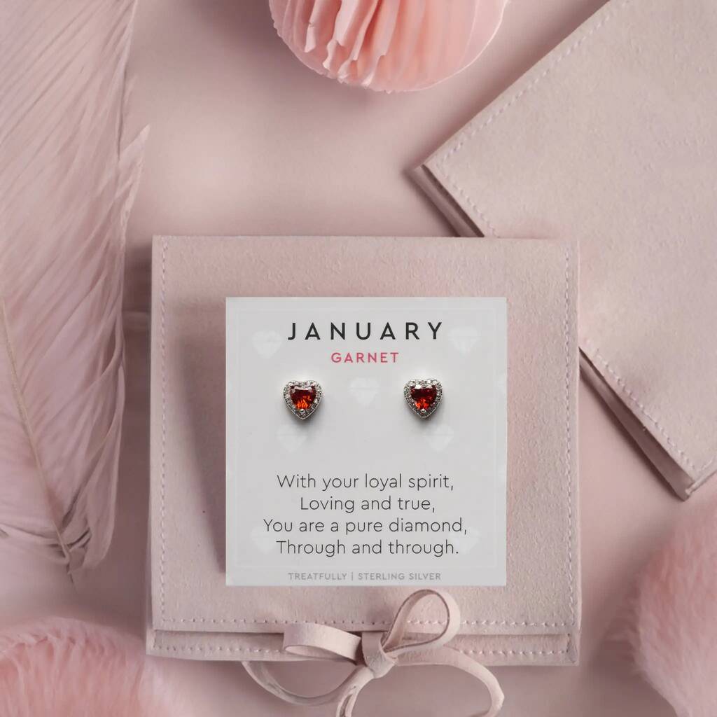A beautiful collaboration with our friends at Treatfully, these earrings are crafted with exquisite details to honour January's birthstone, featuring captivating garnet-coloured cubic zirconia stones.