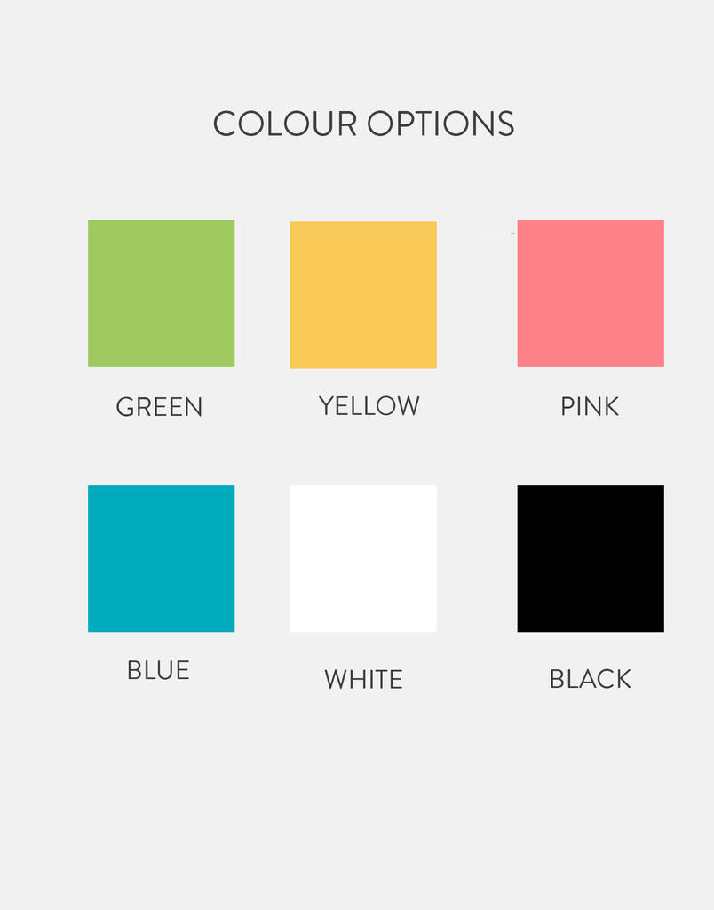 Choose from 5 colours; blakc, pink, green, yellow or blue.