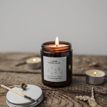 Scented soy wax candle with the label; I miss your face. Missing you candle gift.