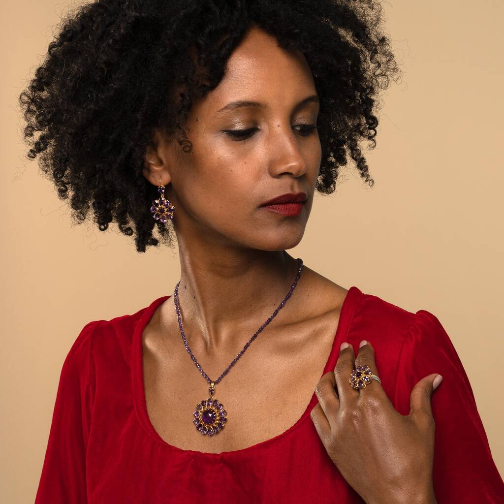 Exquisite limited edition handmade amethyst dangle earringsWe have used hand-cut pear shaped amethysts in these lovely earring. They are made in sterling silver with gold micron plating. The backs of the earrings have exquisite jaali work on them. The colour purple is a very popular fashion choice at the moment, and is associated with sophistication and luxury. These earrings were launched at London Fashion Week and are limited edition. They have a matching pendant and ring.