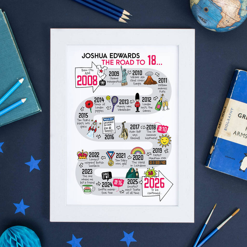 Celebrate an 18th birthday with our fun and personalised timelime print. It's a fab 18th birthday gift for anyone born in 2007/08.