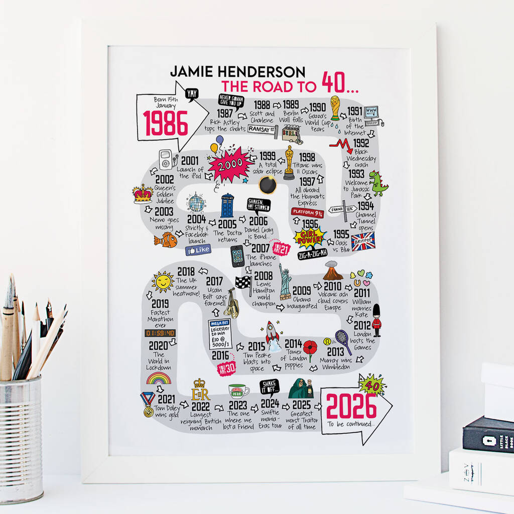 Our fun and quirky personalised 40th birthday print ‘The Road to 40’ is the perfect gift to celebrate pop culture for anyone born in 1985/86