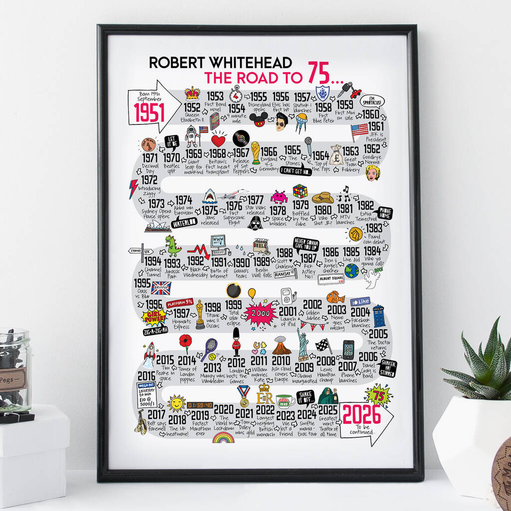 A lovely personalised 75th birthday gift - ‘The Road to 75’ print celebrates 75 years of memories and life stories from 1950 or 1951.