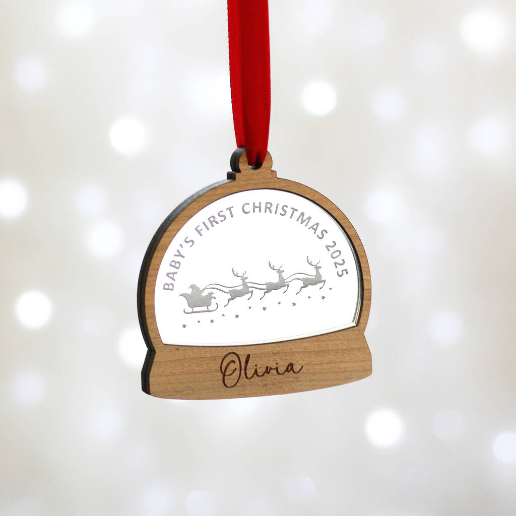 Handmade from wood, silver mirror acrylic and red velvet ribbon, this snow globe style first christmas bauble is really quite beautiful.