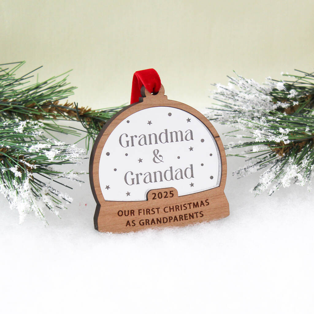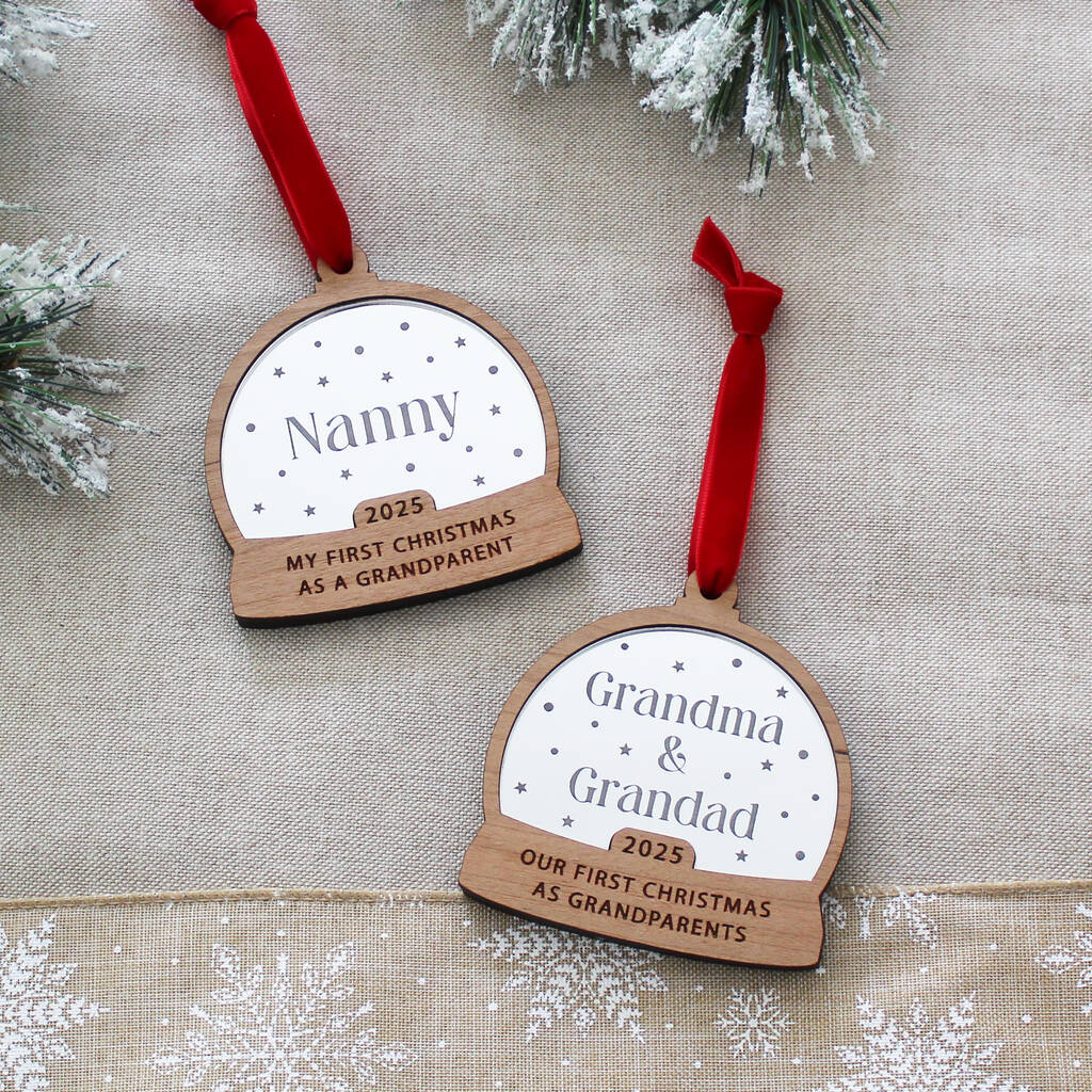 The year and 'Our First Christmas As Grandparents' or 'My First Christmas As A Grandparent' is engraved onto the wood, and the silver mirror acrylic is personalised with one or two names.