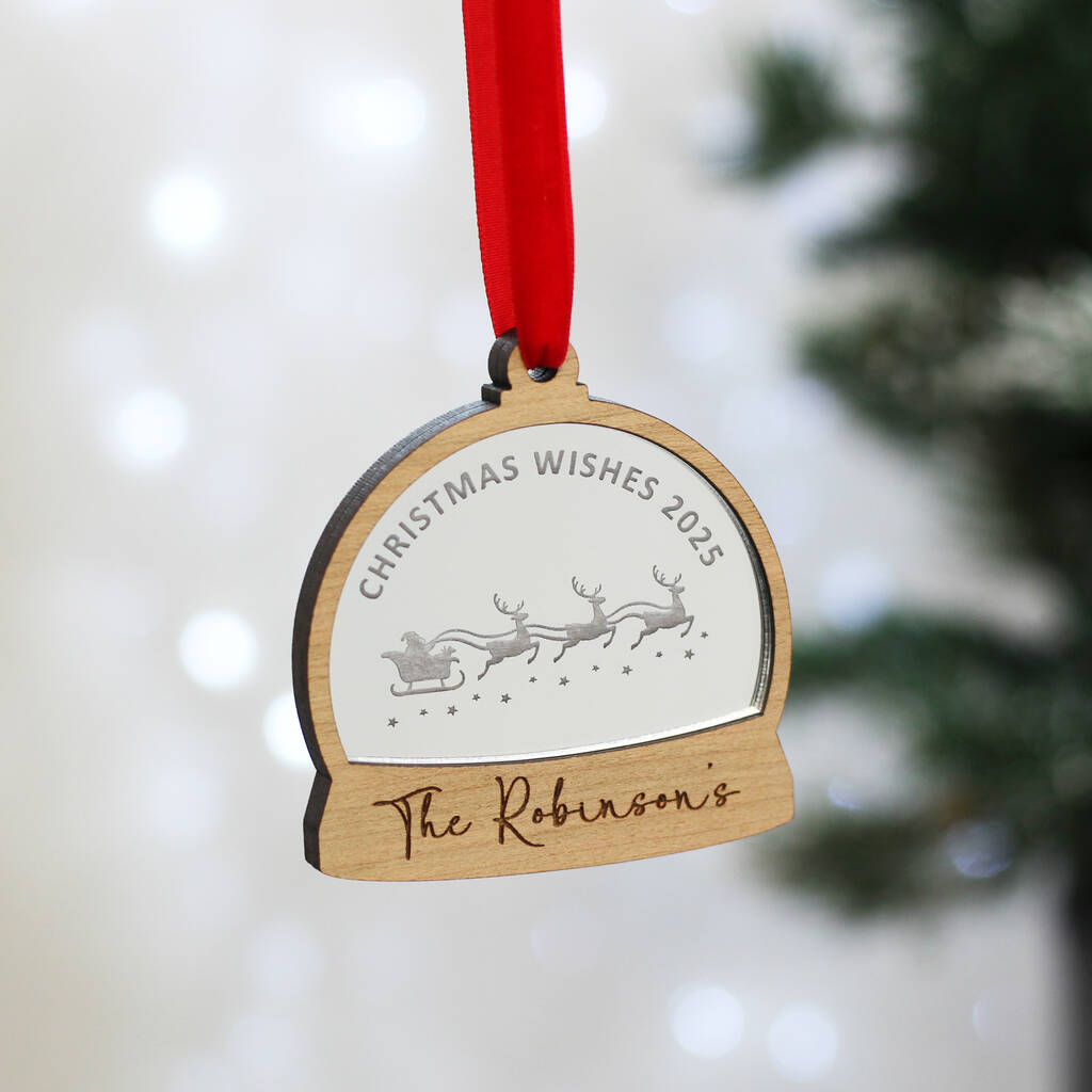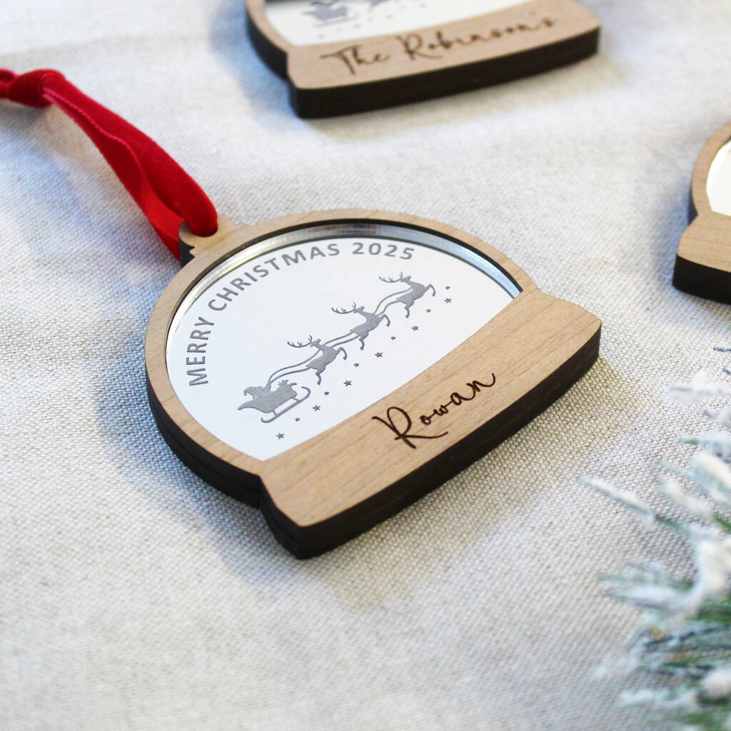 The name is engraved on to the wood in a lovely script font, and the silver mirror acrylic is personalised with Merry Christmas, Happy Christmas or Christmas Wishes.