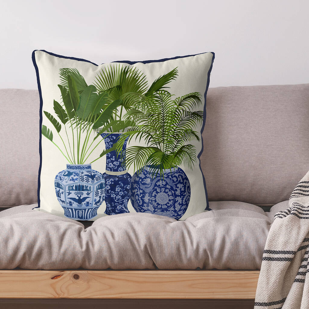 Hand dawn illustration of a three beautiful chinoiserie vases with exotic palm leaves on a cotton cushion cover with coordinating piping.Handmade in the UK to order, these unusual eye catching cushions feature the illustrations of UK artist Kelly Stevens-McLaughlan. Kellys images are known world wide and are fabulous for adding quirky elegance to any home.