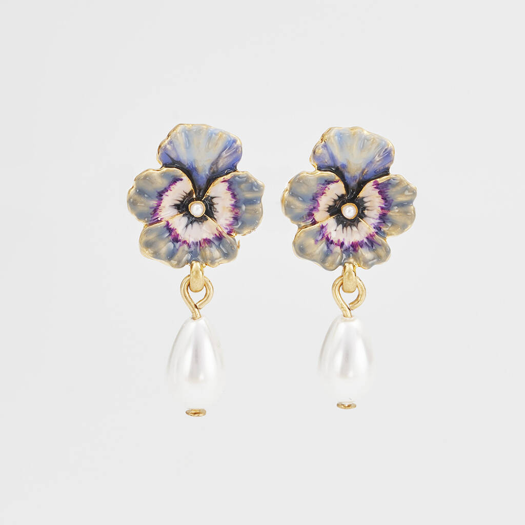 Gold Pansy And Pearl Drop Stud Earrings