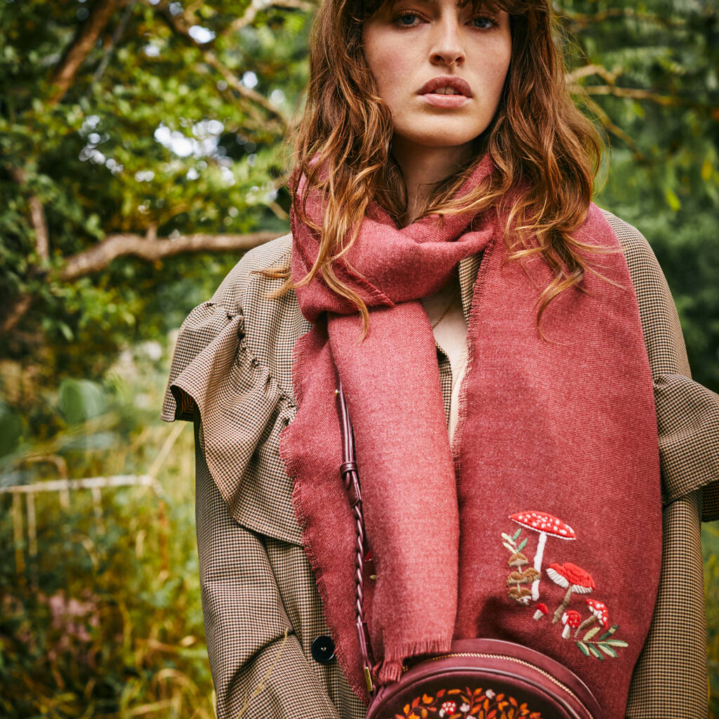Mushroom Embroidered Burgundy Pashmina Scarf
