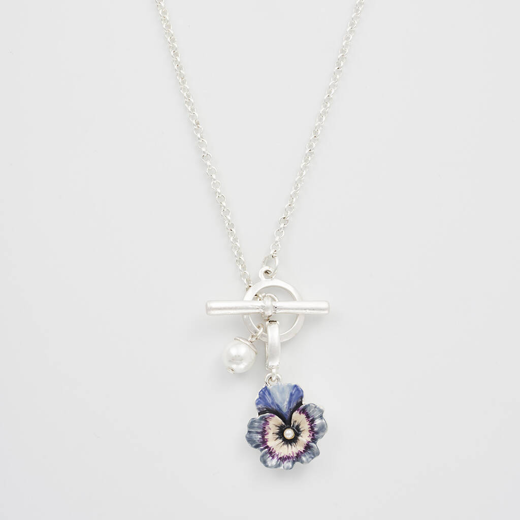 Silver Pansy And Pearl Toggle Necklace